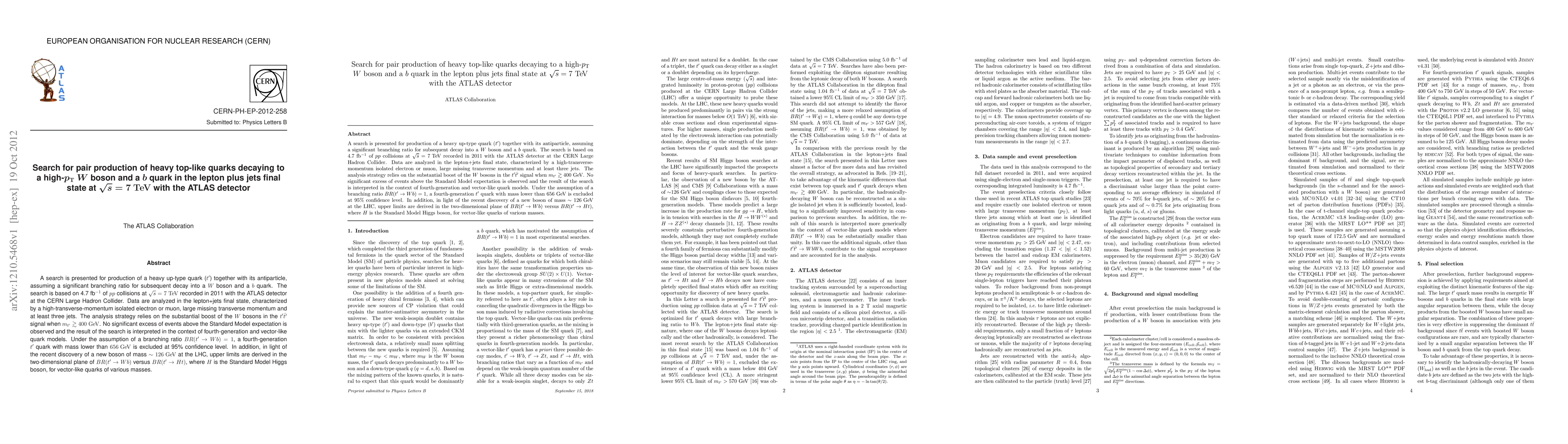 A search is presented for production of a heavy up-type quark (t') together with its antiparticle, assuming a significant branching ratio for subsequent decay into a W boson and a b quark. The search is based on 4.7 fb^-1 of pp collisions at sqrt(s)=7 TeV recorded in 2011 with the ATLAS detector at the CERN Large Hadron Collider. Data are analyzed in the lepton+jets final state, characterized by a high-transverse-momentum isolated electron or muon, large missing transverse momentum and at least three jets. The analysis strategy relies on the substantial boost of the W bosons in the t't'bar signal when mt'>=400 GeV. No significant excess of events above the Standard Model expectation is observed and the result of the search is interpreted in the context of fourth-generation and vector-like quark models. Under the assumption of a branching ratio BR(t'->Wb)=1, a fourth-generation t' quark with mass lower than 656 GeV is excluded at 95% confidence level. In addition, in light of the recent discovery of a new boson of mass ~126 GeV at the LHC, upper limits are derived in the two-dimensional plane of BR(t'->Wb) versus BR(t'->Ht), where H is the Standard Model Higgs boson, for vector-like quarks of various masses.