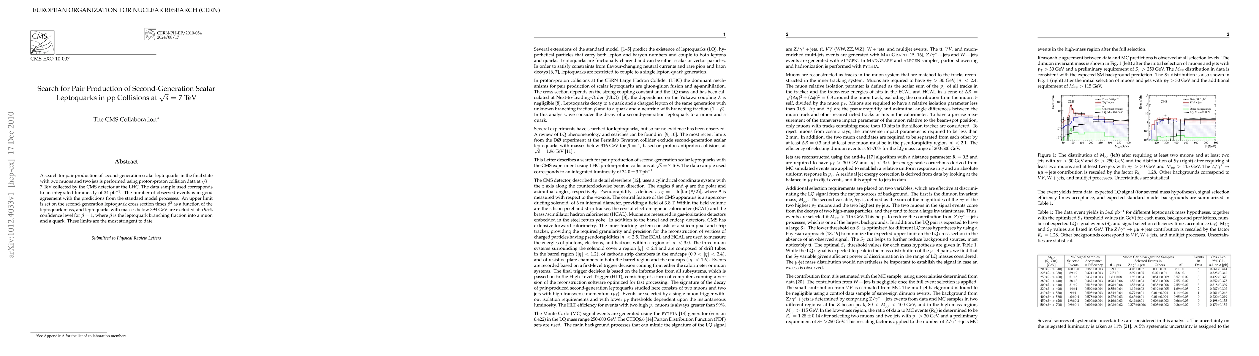 This paper reports a search for second-generation scalar leptoquarks in proton-proton collisions at 7 TeV using CMS data from the LHC, finding no evidence for their production. It sets stringent upper limits on their cross section, excluding leptoquarks with masses below 394 GeV at 95% confidence level.