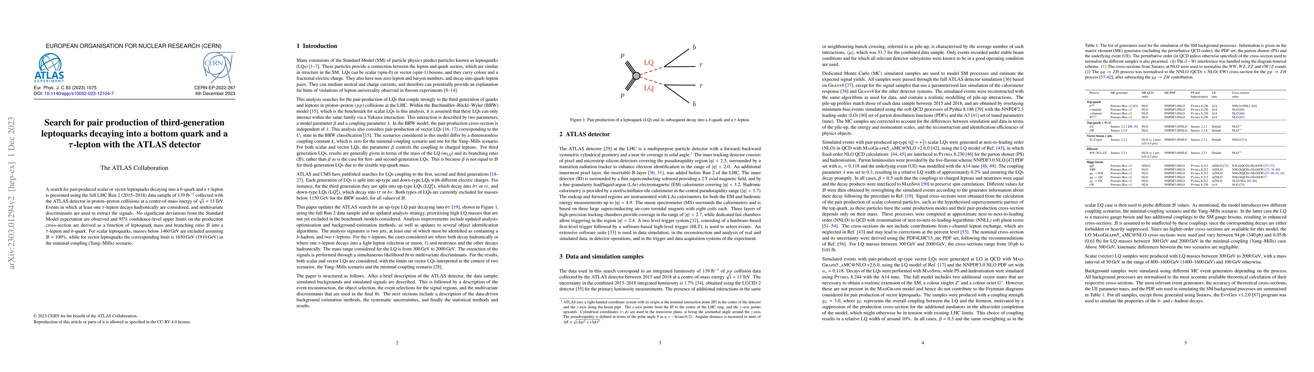This paper reports a search for pair-produced leptoquarks decaying into a bottom quark and a tau lepton using the ATLAS detector at the LHC, finding no significant deviations from the Standard Model and setting upper limits on their production cross-sections. For scalar leptoquarks, masses below 1460 GeV are excluded, while for vector leptoquarks, masses below 1650 GeV (1910 GeV) are excluded in minimal-coupling scenarios.