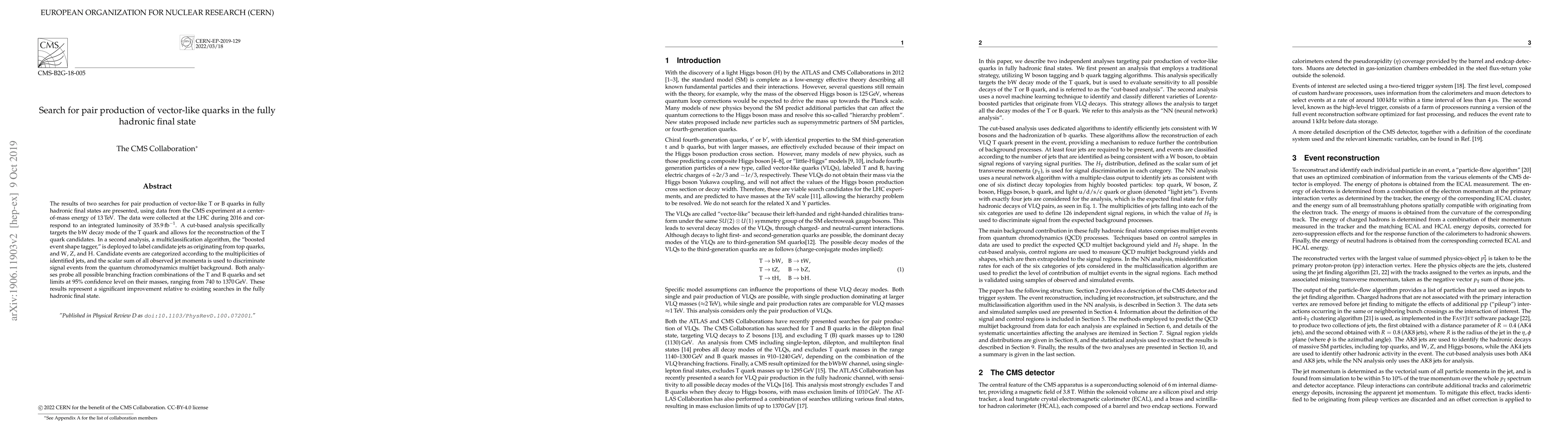 This paper presents results from two searches for pair production of vector-like T and B quarks in fully hadronic final states using CMS data from 2016. Both analyses set new limits on the masses of these quarks, ranging from 740 to 1370 GeV, representing an improvement over previous searches.