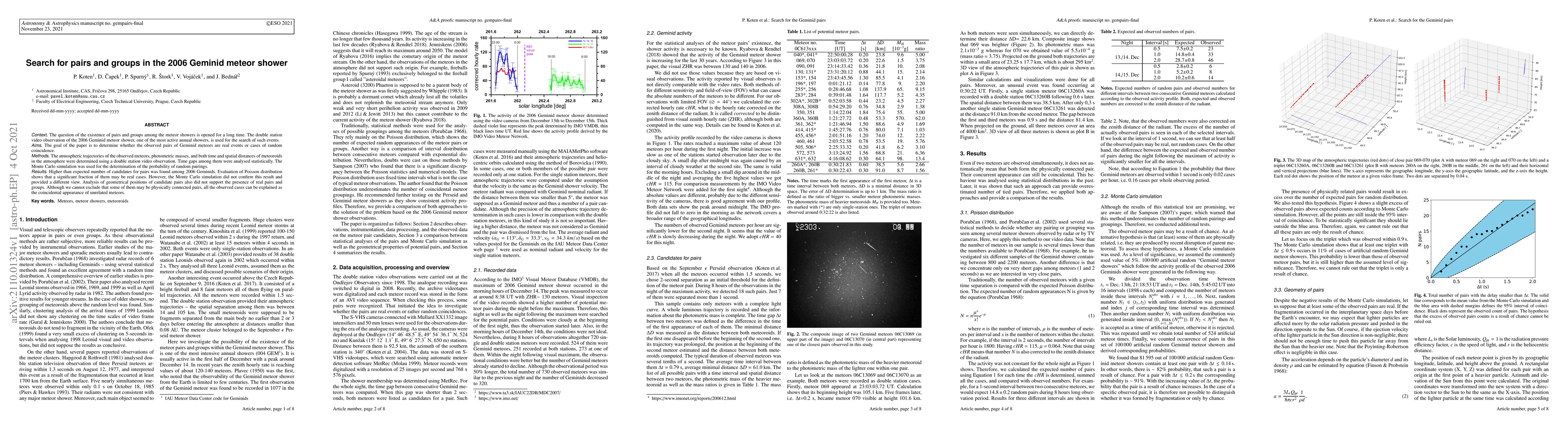 Researchers analyzed 2006 Geminid meteor shower data to search for pairs and groups of meteors, finding a higher than expected number of candidates, but simulations suggest most are coincidental appearances of unrelated meteors.
