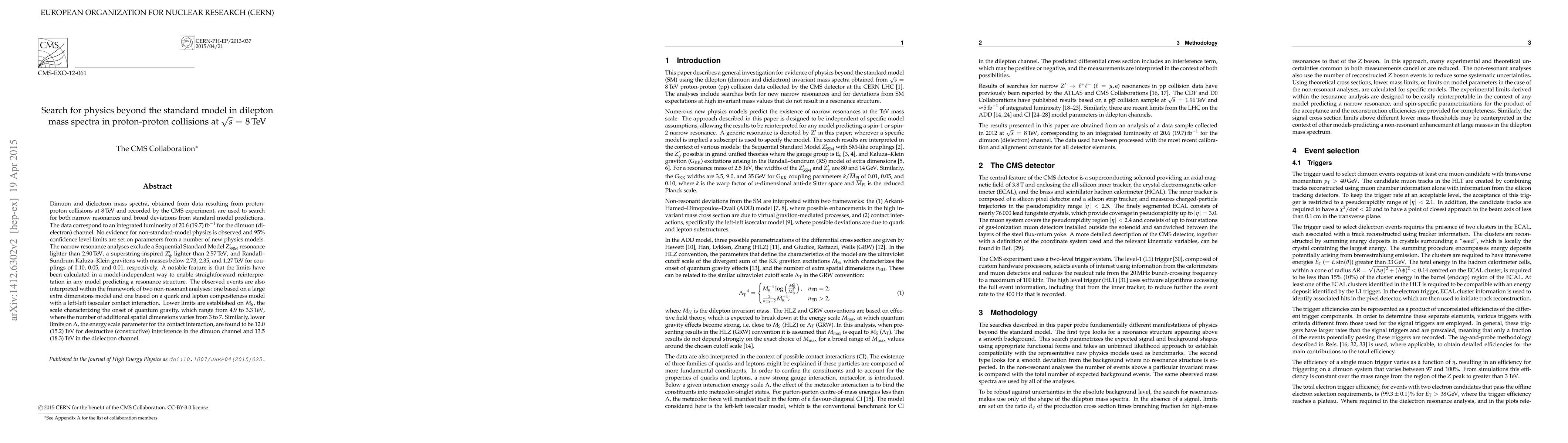 Dimuon and dielectron mass spectra, obtained from data resulting from proton-proton collisions at 8 TeV and recorded by the CMS experiment, are used to search for both narrow resonances and broad deviations from standard model predictions. The data correspond to an integrated luminosity of 20.6 (19.7) inverse femtobarns for the dimuon (dielectron) channel. No evidence for non-standard-model physics is observed and 95% confidence level limits are set on parameters from a number of new physics models. The narrow resonance analyses exclude a Sequential Standard Model Z'[SSM] resonance lighter than 2.90 TeV, a superstring-inspired Z'[psi] lighter than 2.57 TeV, and Randall-Sundrum Kaluza-Klein gravitons with masses below 2.73, 2.35, and 1.27 TeV for couplings of 0.10, 0.05, and 0.01, respectively. A notable feature is that the limits have been calculated in a model-independent way to enable straightforward reinterpretation in any model predicting a resonance structure. The observed events are also interpreted within the framework of two non-resonant analyses: one based on a large extra dimensions model and one based on a quark and lepton compositeness model with a left-left isoscalar contact interaction. Lower limits are established on M[S], the scale characterizing the onset of quantum gravity, which range from 4.9 to 3.3 TeV, where the number of additional spatial dimensions varies from 3 to 7. Similarly, lower limits on Lambda, the energy scale parameter for the contact interaction, are found to be 12.0 (15.2) TeV for destructive (constructive) interference in the dimuon channel and 13.5 (18.3) TeV in the dielectron channel.
