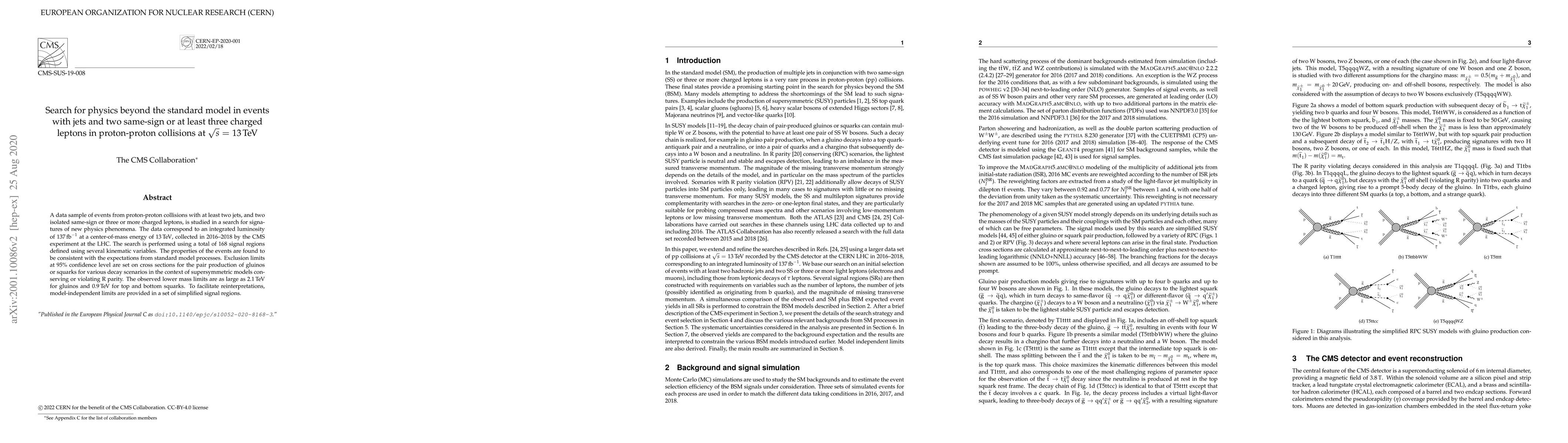 A data sample of events from proton-proton collisions with at least two jets, and two isolated same-sign or three or more charged leptons, is studied in a search for signatures of new physics phenomena. The data correspond to an integrated luminosity of 137 fb$^{-1}$ at a center-of-mass energy of 13 TeV, collected in 2016-2018 by the CMS experiment at the LHC. The search is performed using a total of 168 signal regions defined using several kinematic variables. The properties of the events are found to be consistent with the expectations from standard model processes. Exclusion limits at 95% confidence level are set on cross sections for the pair production of gluinos or squarks for various decay scenarios in the context of supersymmetric models conserving or violating R parity. The observed lower mass limits are as large as 2.1 TeV for gluinos and 0.9 TeV for top and bottom squarks. To facilitate reinterpretations, model-independent limits are provided in a set of simplified signal regions.