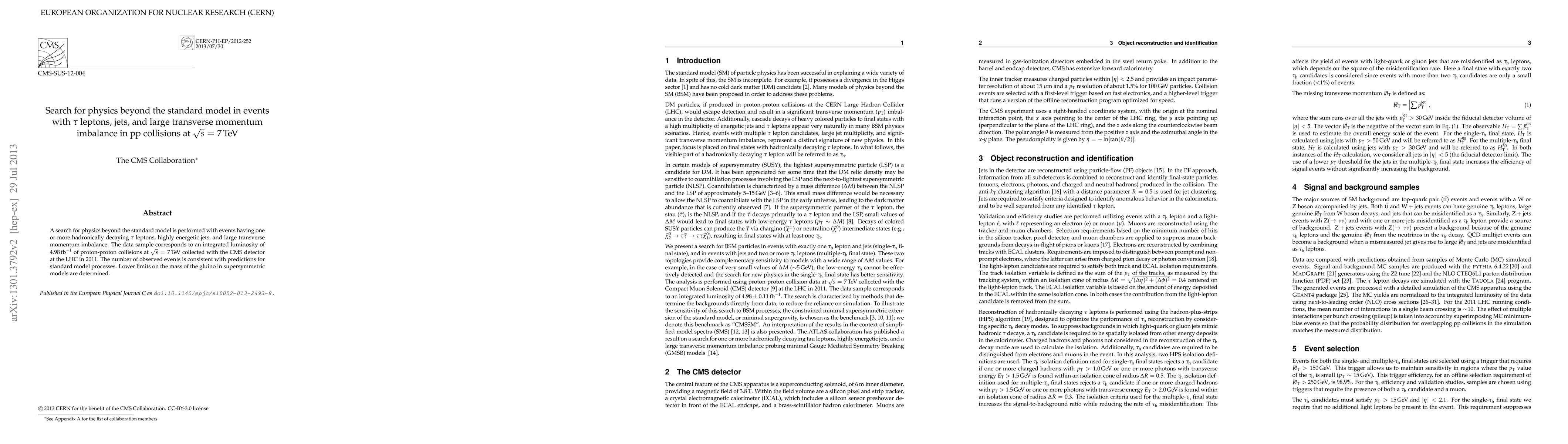 A search for physics beyond the standard model is performed with events having one or more hadronically decaying tau leptons, highly energetic jets, and large transverse momentum imbalance. The data sample corresponds to an integrated luminosity of 4.98 inverse femtobarns of proton-proton collisions at sqrt(s) = 7 TeV collected with the CMS detector at the LHC in 2011. The number of observed events is consistent with predictions for standard model processes. Lower limits on the mass of the gluino in supersymmetric models are determined.
