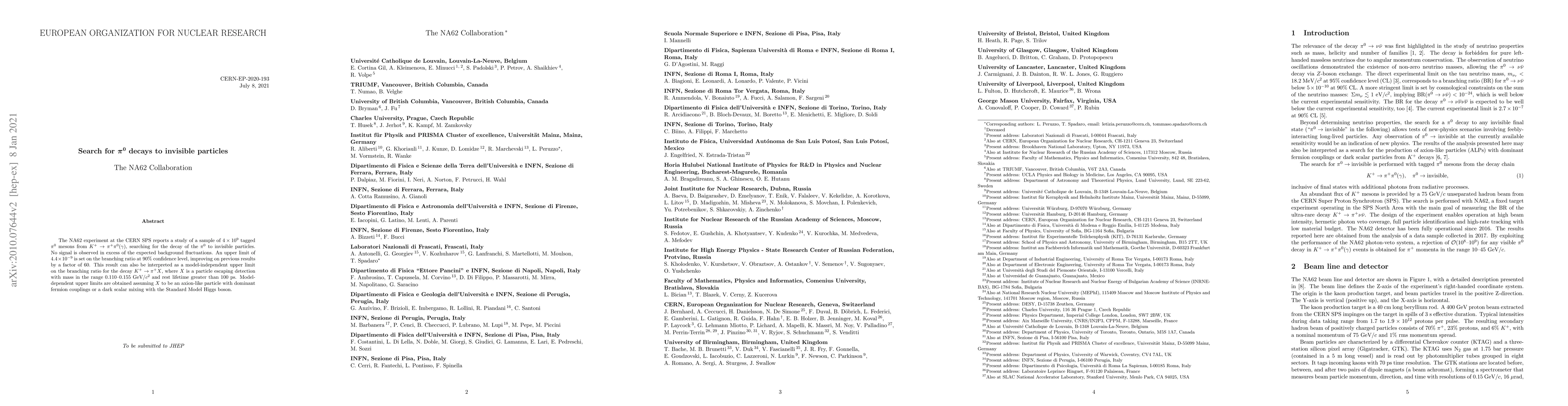 The NA62 experiment at the CERN SPS reports a study of a sample of $4 \times10^{9}$ tagged $\pi^0$ mesons from $K^+ \to \pi^+ \pi^0 (\gamma)$, searching for the decay of the $\pi^0$ to invisible particles. No signal is observed in excess of the expected background fluctuations. An upper limit of $4.4 \times10^{-9}$ is set on the branching ratio at 90% confidence level, improving on previous results by a factor of 60. This result can also be interpreted as a model-independent upper limit on the branching ratio for the decay $K^+ \to \pi^+ X$, where $X$ is a particle escaping detection with mass in the range 0.110-0.155 GeV$/c^2$ and rest lifetime greater than 100 ps. Model-dependent upper limits are obtained assuming $X$ to be an axion-like particle with dominant fermion couplings or a dark scalar mixing with the Standard Model Higgs boson.