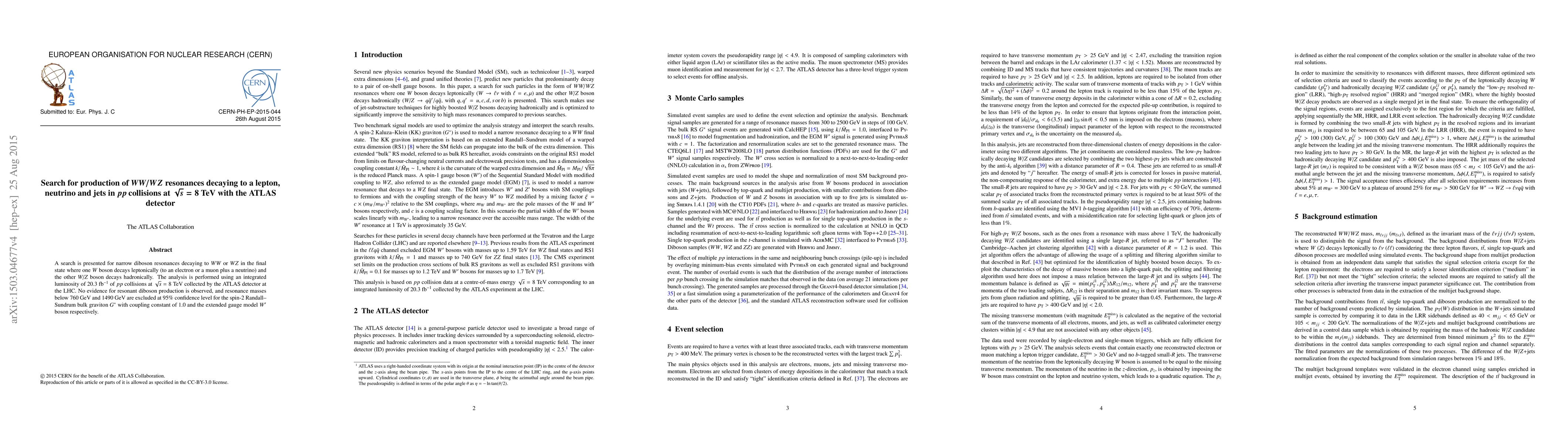 A search is presented for narrow diboson resonances decaying to $WW$ or $WZ$ in the final state where one $W$ boson decays leptonically (to an electron or a muon plus a neutrino) and the other $W/Z$ boson decays hadronically. The analysis is performed using an integrated luminosity of 20.3 fb$^{-1}$ of $pp$ collisions at $\sqrt{s}$ = 8 TeV collected by the ATLAS detector at the LHC. No evidence for resonant diboson production is observed, and resonance masses below 700 GeV and 1490 GeV are excluded at 95% confidence level for the spin-2 Randall-Sundrum bulk graviton $G^*$ with coupling constant of 1.0 and the extended gauge model $W'$ boson respectively.