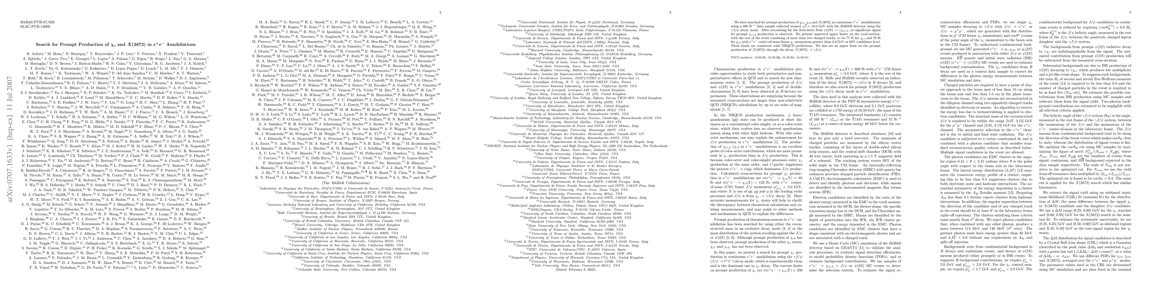 We have searched for prompt production of $\chi_{c1}$, $\chi_{c2}$ and X(3872) in continuum e^+e^- annihilations using a 386 fb^{-1} data sample collected around $\sqrt{s} = 10.6$ GeV with the BABAR detector using the $\gamma J/\psi$ decay mode. After accounting for the feed-down from $\psi(2S)\to\gamma\chi_{c1,2}$, no significant signal for prompt $\chi_{c1,2}$ production is observed. We present improved upper limits on the cross-section, with the rest of the event consisting of more than two charged tracks, to be 77 fb for $\chi_{c1}$ and 79 fb for $\chi_{c2}$ with $e^+e^-$ center-of-mass frame $\chi_c$ momentum greater than 2.0 GeV at 90% confidence level. These limits are consistent with NRQCD predictions. We also set an upper limit on the prompt production of X(3872) through the decay $X(3872)\to \gamma J/\psi$.
