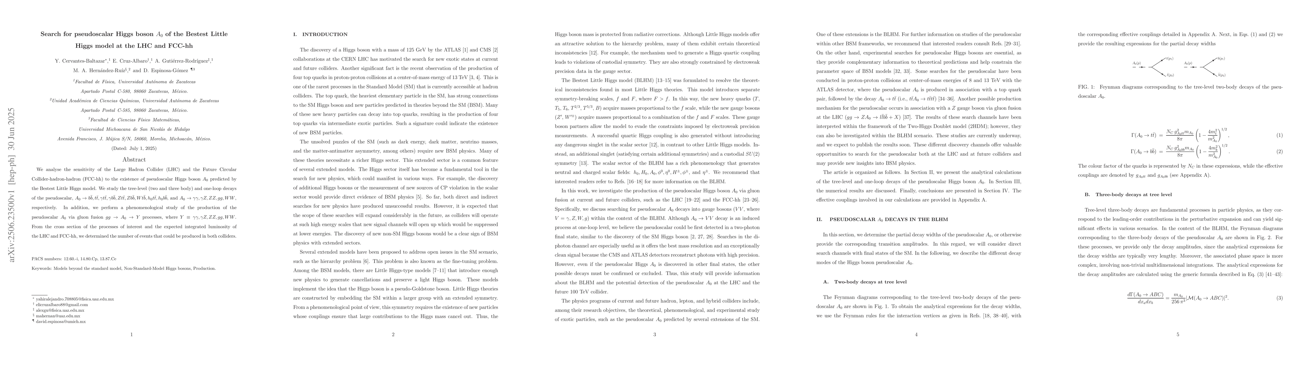 This research examines the detectability of the pseudoscalar Higgs boson $A_0$ from the Bestest Little Higgs model at the LHC and FCC-hh colliders. It evaluates various decay channels and production processes, estimating event yields based on cross-sections and collider luminosities.