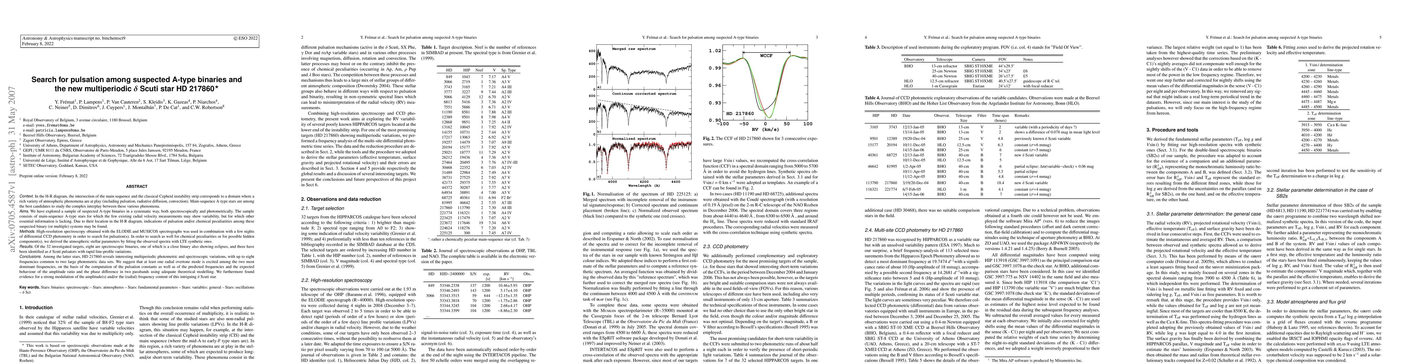 We have explored a sample of suspected A-type binaries in a systematic way, both spectroscopically and photometrically. Due to their location in the H-R diagram, indications of pulsation and/or chemical peculiarities among these suspected binary (or multiple) systems may be found. High-resolution spectroscopy obtained with the ELODIE and MUSICOS spectrographs was used in combination with a few nights of differential CCD photometry in order to search for pulsation(s). Of the 32 investigated targets, eight are spectroscopic binaries, one of which is a close binary also showing eclipses, and three have been identified as Delta Scuti pulsators with rapid line-profile variations. Among the latter stars, HD 217860 reveals interesting multiperiodic photometric and spectroscopic variations, with up to eight frequencies common to two large photometric data sets. We suggest that at least one radial overtone mode is excited among the two most dominant frequencies. We furthermore found evidence for a strong modulation of the amplitude(s) and/or the (radial) frequency content of this intriguing Delta Scuti star.