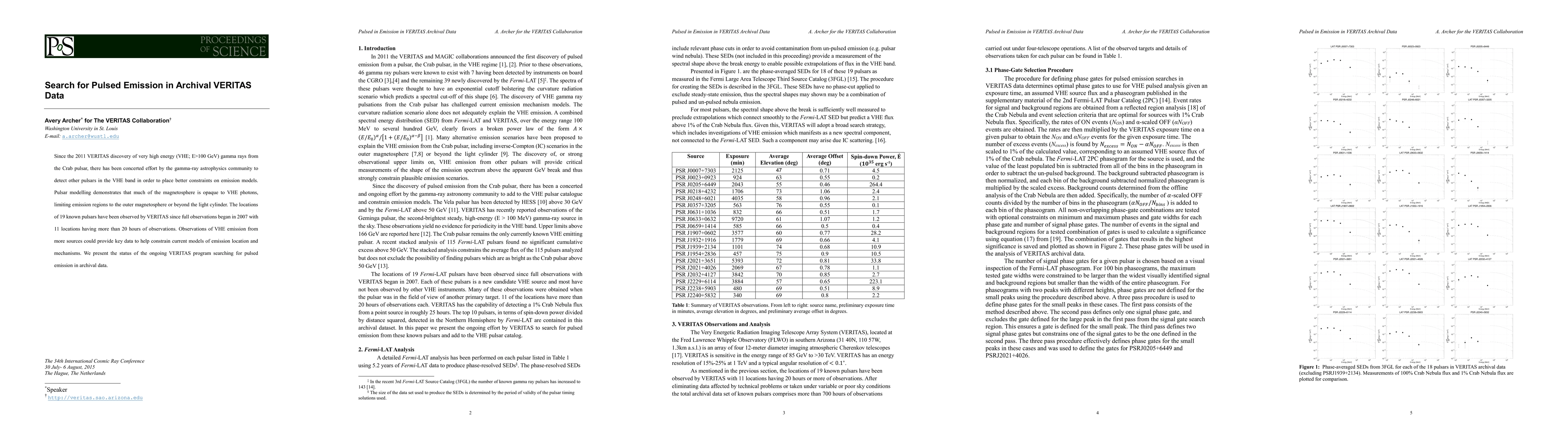 This paper reports on the VERITAS observatory's ongoing efforts to detect pulsed emission from 19 pulsars in very high energy gamma rays, aiming to refine emission models and understand the magnetosphere's opacity to VHE photons. The analysis focuses on archival data from observations since 2007, with some pulsars having over 20 hours of monitoring.
