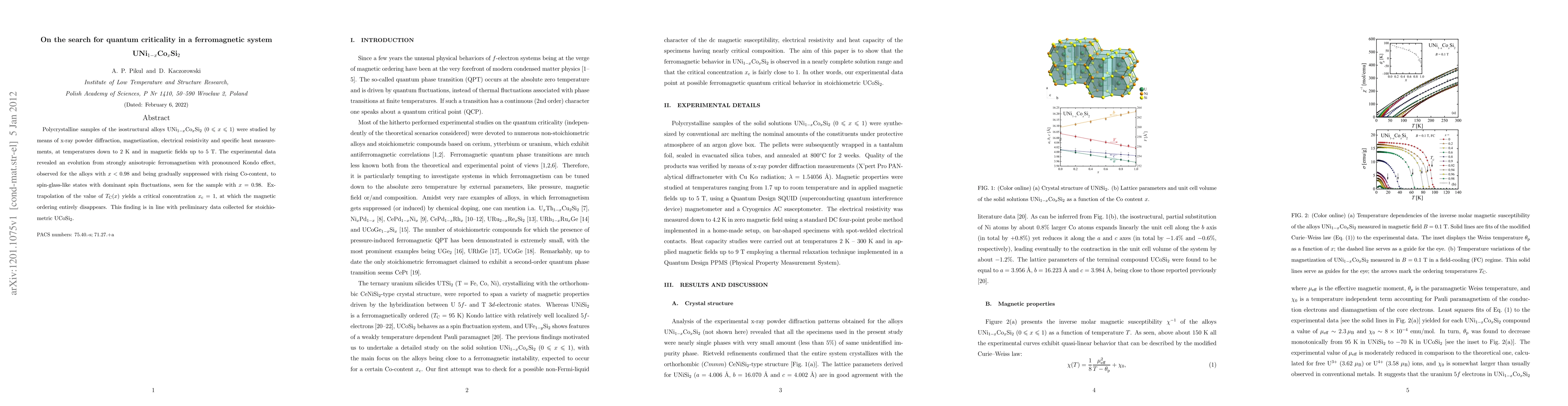Polycrystalline samples of the isostructural alloys UNi1-xCoxSi2 (0 <= x <= 1) were studied by means of x-ray powder diffraction, magnetization, electrical resistivity and specific heat measurements, at temperatures down to 2 K and in magnetic fields up to 5 T. The experimental data revealed an evolution from strongly anisotropic ferromagnetism with pronounced Kondo effect, observed for the alloys with x < 0.98 and being gradually suppressed with rising Co-content, to spin-glass-like states with dominant spin fluctuations, seen for the sample with x = 0.98. Extrapolation of the value of TC(x) yields a critical concentration xc = 1, at which the magnetic ordering entirely disappears. This finding is in line with preliminary data collected for stoichiometric UCoSi2.