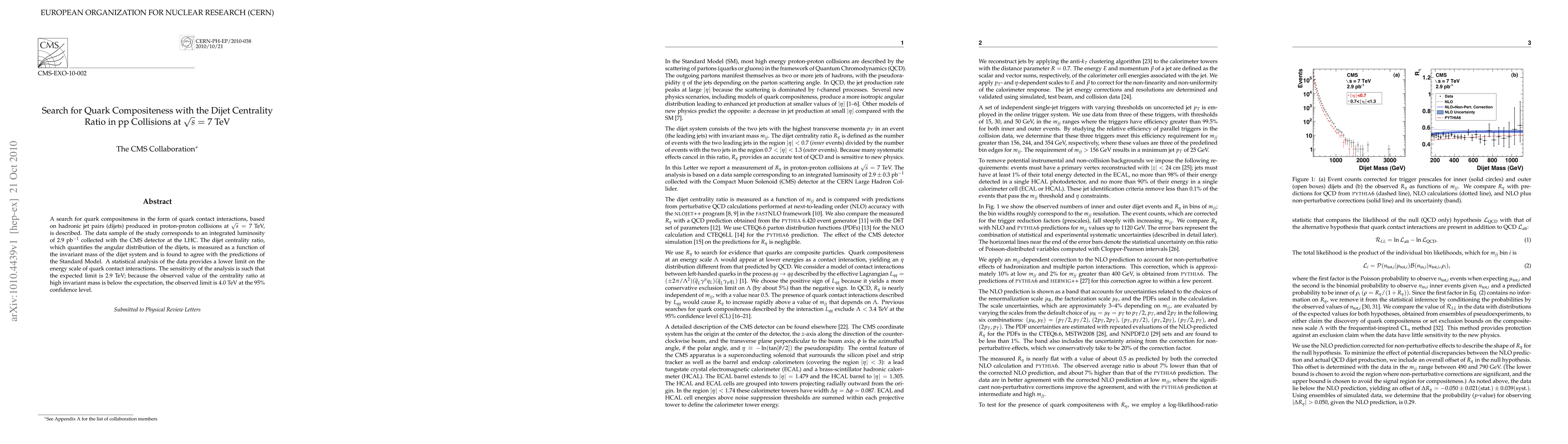 This study investigates quark compositeness through quark contact interactions using dijet events in proton-proton collisions at 7 TeV. The analysis of the dijet centrality ratio found agreement with Standard Model predictions, setting an observed limit of 4.0 TeV for quark compositeness at 95% confidence level.