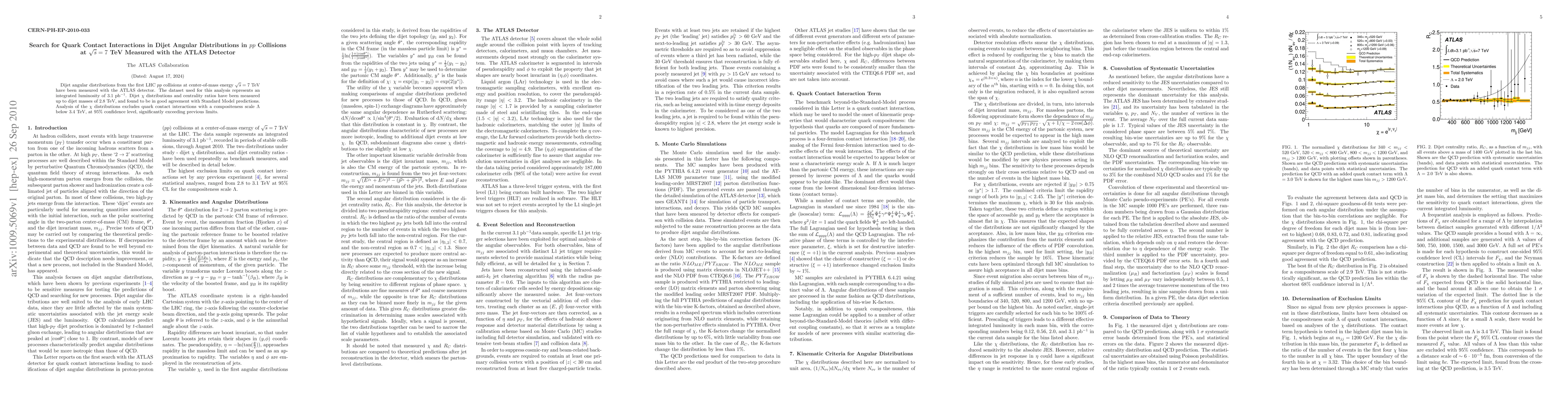 Dijet angular distributions from the first LHC pp collisions at center-of-mass energy sqrt(s) = 7 TeV have been measured with the ATLAS detector. The dataset used for this analysis represents an integrated luminosity of 3.1 pb-1. Dijet $\chi$ distributions and centrality ratios have been measured up to dijet masses of 2.8 TeV, and found to be in good agreement with Standard Model predictions. Analysis of the $\chi$ distributions excludes quark contact interactions with a compositeness scale $\Lambda$ below 3.4 TeV, at 95% confidence level, significantly exceeding previous limits.