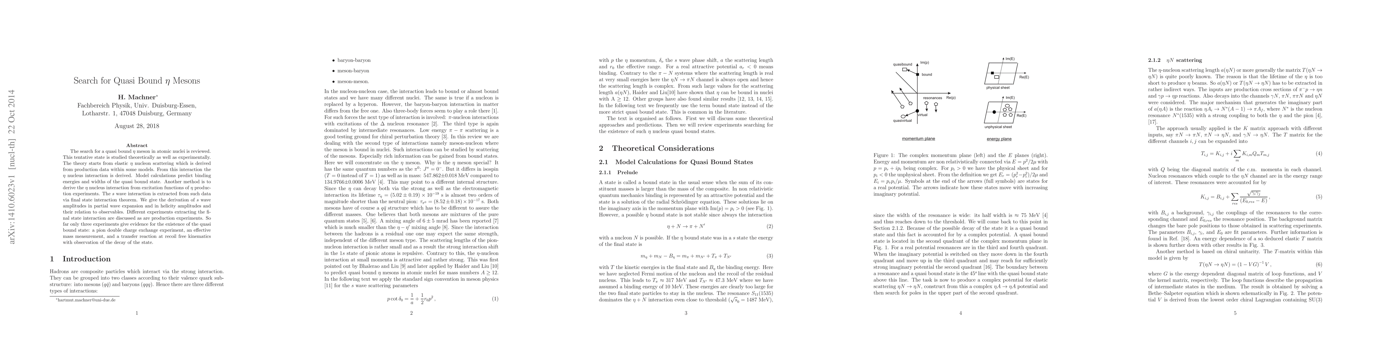 The search for a quasi bound $\eta$ meson in atomic nuclei is reviewed. This tentative state is studied theoretically as well as experimentally. The theory starts from elastic $\eta$ nucleon scattering which is derived from production data within some models. From this interaction the $\eta$ nucleus interaction is derived. Model calculations predict binding energies and widths of the quasi bound state. Another method is to derive the $\eta$ nucleus interaction from excitation functions of $\eta$ production experiments. The $s$ wave interaction is extracted from such data via final state interaction theorem. We give the derivation of $s$ wave amplitudes in partial wave expansion and in helicity amplitudes and their relation to observables. Different experiments extracting the final state interaction are discussed as are production experiments. So far only three experiments give evidence for the existence of the quasi bound state: a pion double charge exchange experiment, an effective mass measurement, and a transfer reaction at recoil free kinematics with observation of the decay of the state.