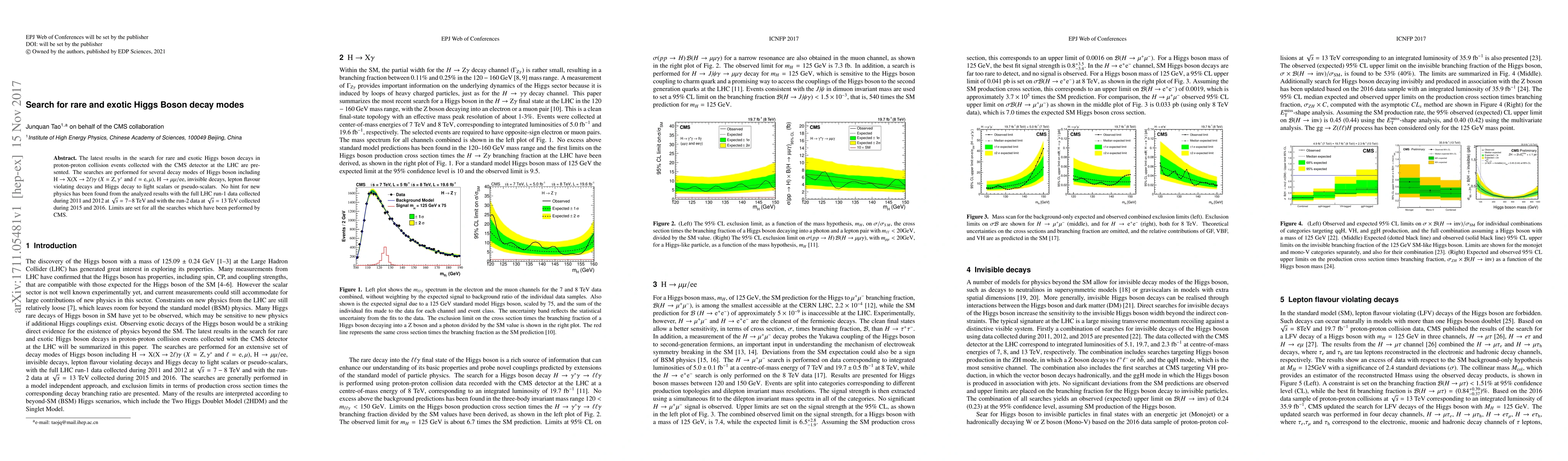 This paper reports on the search for rare and exotic Higgs boson decay modes using data from the CMS detector at the LHC, finding no evidence for new physics in various decay channels, including lepton flavor violation and invisible decays. Limits are established for all explored decay modes.