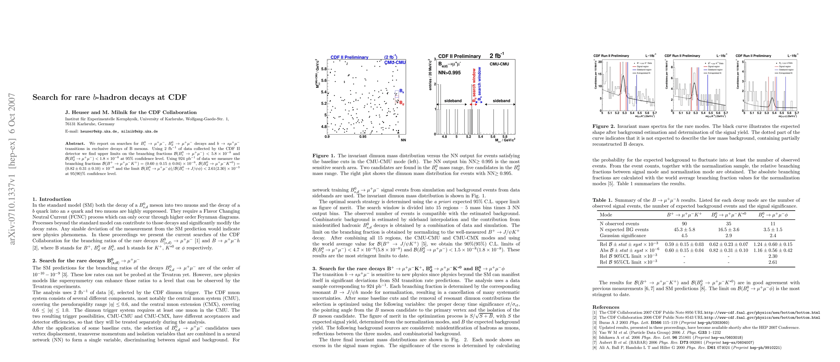 We report on searches for B^0_s to \mu^+ \mu^-, B^0_d to \mu^+ \mu^- decays and b to s \mu^+\mu^- transitions in exclusive decays of B mesons. Using 2 fb^{-1} of data collected by the CDF II detector we find upper limits on the branching fractions B(B^0_s to \mu^+ \mu^-) < 5.8 x 10^{-8} and B(B^0_d to \mu^+ \mu^-) < 1.8 x 10^{-8} at 95% confidence level. Using 924 pb^{-1} of data we measure the branching fractions B(B^+ to \mu^+ \mu^- K^+) = (0.60 \pm 0.15 \pm 0.04) x 10^{-6}, B(B^0_d to \mu^+ \mu^- K^{*0}) = (0.82 \pm 0.31 \pm 0.10) x 10^{-6} and the limit B(B^0_s to \mu^+ \mu^- phi)/B(B^0_s to J/\psi\phi) < 2.61(2.30) x 10^{-3} at 95(90)% confidence level.