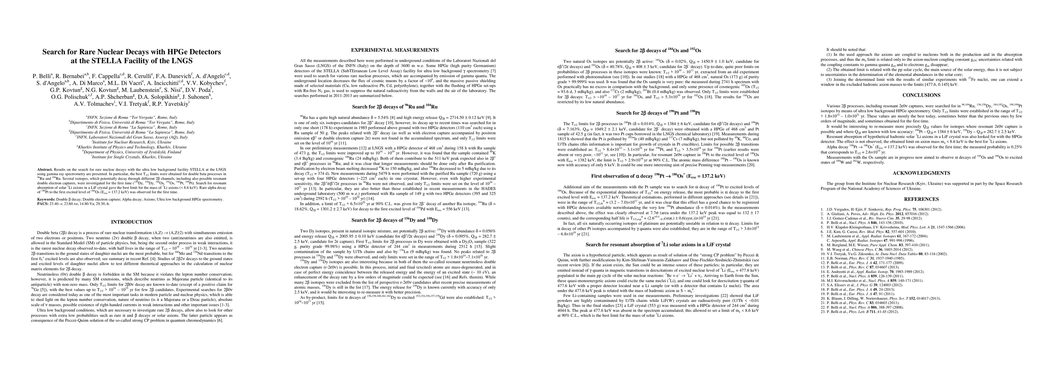 Researchers at STELLA facility reported improved limits for detecting rare nuclear decays, including double beta processes and alpha decay of 190Pt to a new excited state of 186Os. They also set a limit on the mass of 7Li axions.