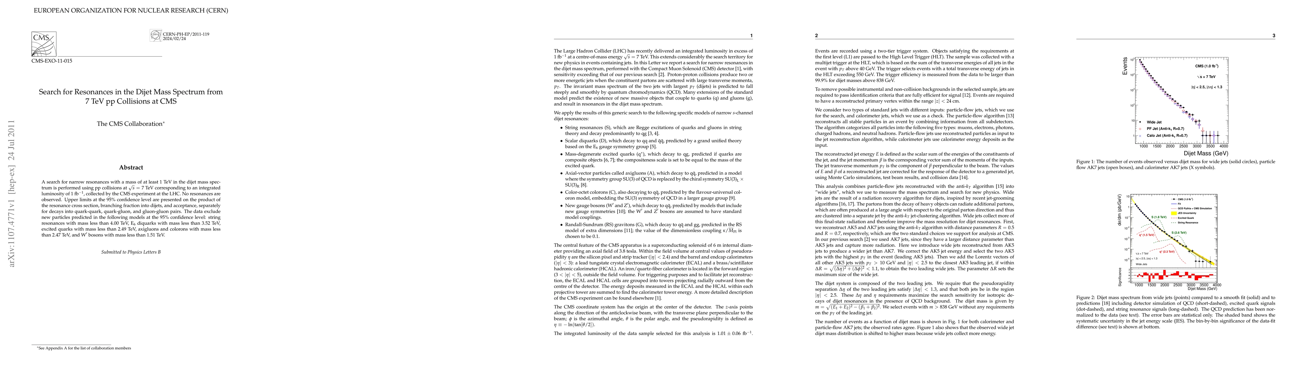 The CMS experiment at the LHC searched for narrow resonances in the dijet mass spectrum from 7 TeV proton-proton collisions but found no evidence of such resonances. Upper limits were set on the cross sections for several theoretical models, excluding new particles predicted by these models.