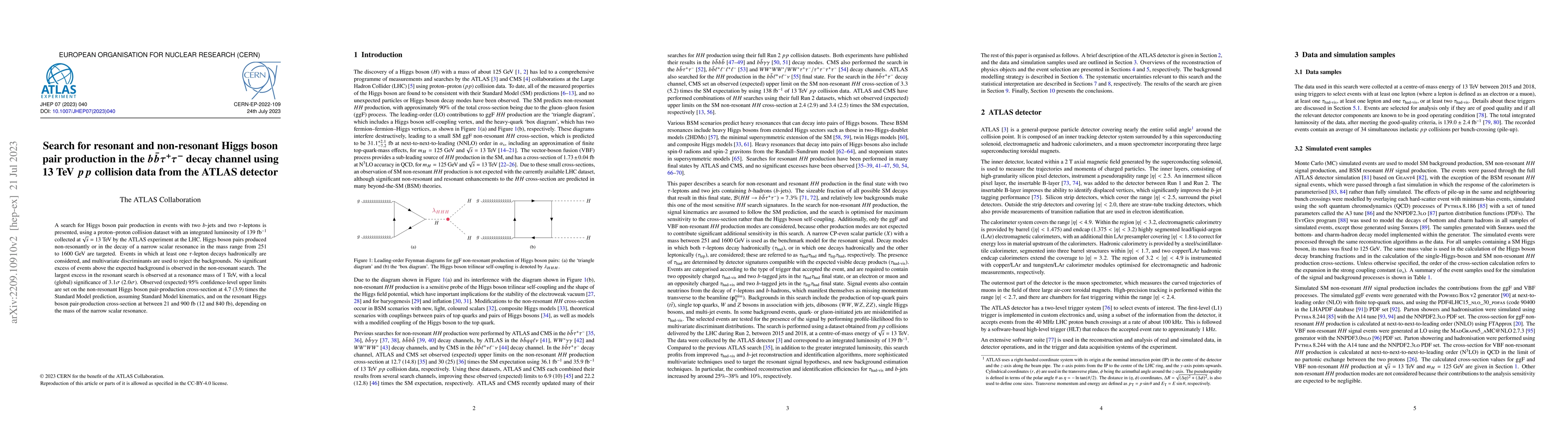 This paper reports a search for Higgs boson pair production in the $b\bar b\tau^+\tau^-$ decay channel using 139 fb$^{-1}$ of 13 TeV proton-proton collision data from the ATLAS detector at the LHC. No significant excess is observed, but a local 3.1σ excess is seen at a resonance mass of 1 TeV.