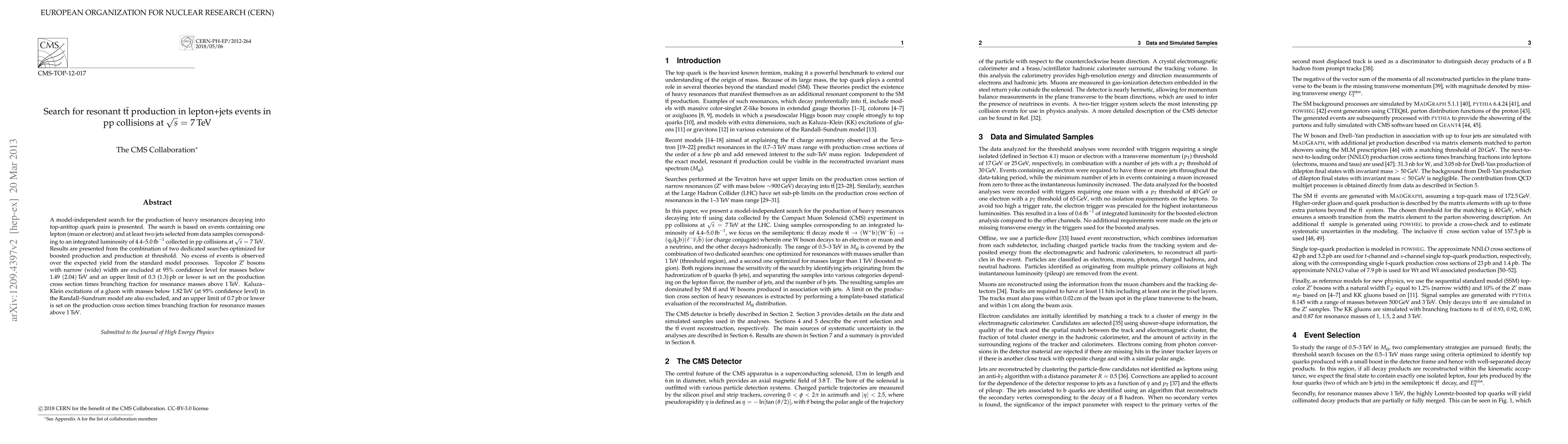 This paper presents a model-independent search for heavy resonances decaying into top-antitop quark pairs in 7 TeV proton-proton collision data, finding no excess over standard model predictions. It excludes Topcolor Z' bosons and Randall-Sundrum model gluons below certain masses and sets upper limits on their production cross sections.