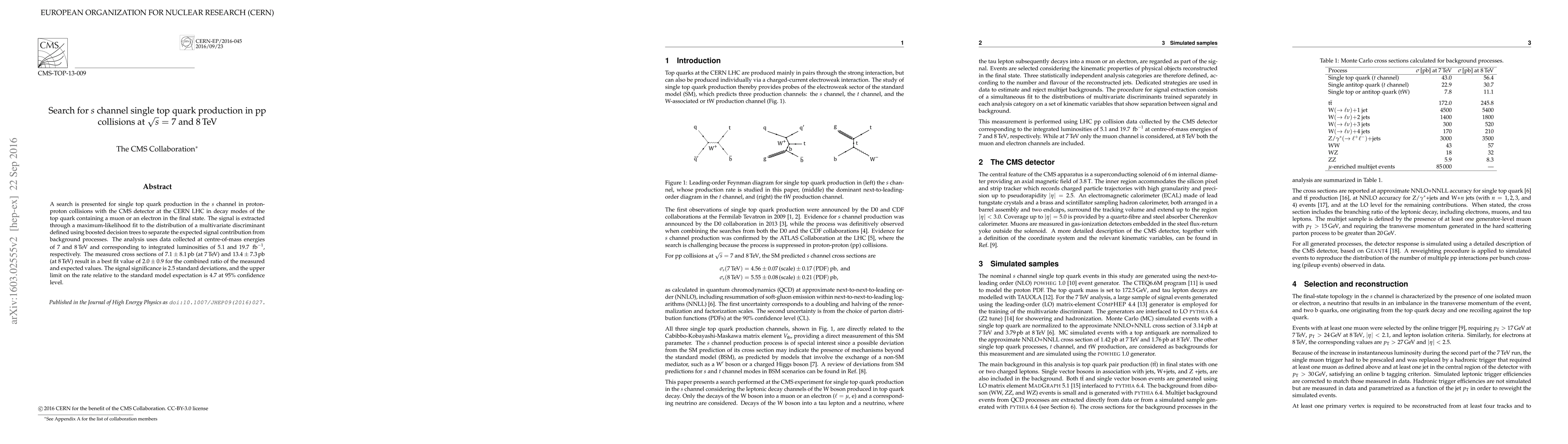 This paper reports a search for single top quark production in the s channel using the CMS detector at the LHC, analyzing proton-proton collisions at 7 and 8 TeV. The study finds a signal significance of 2.5 standard deviations with an upper limit on the production rate at 95% confidence level.