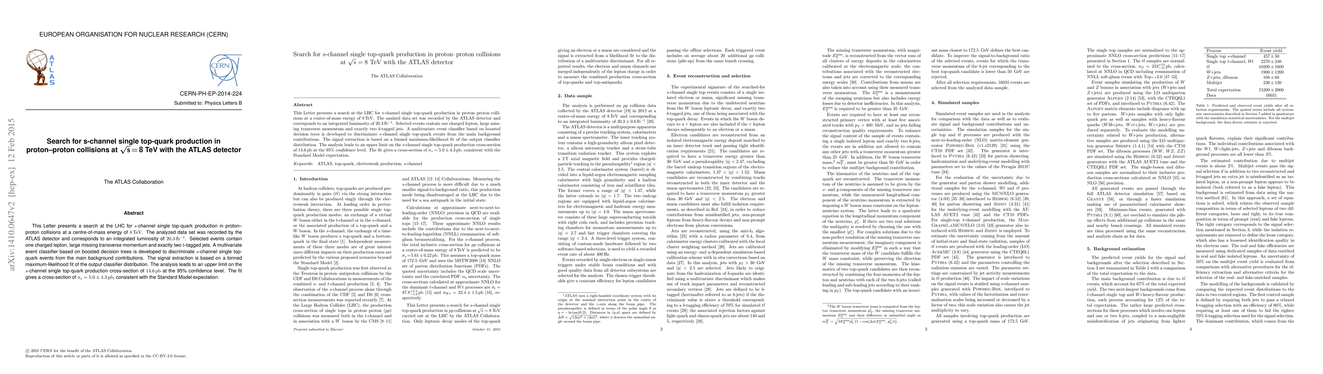 The ATLAS detector searched for s-channel single top-quark production in proton-proton collisions at 8 TeV, setting an upper limit of 14.6 pb at 95% confidence level.