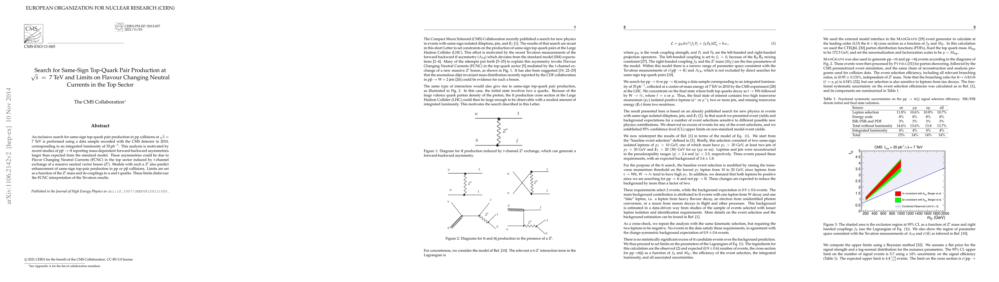 This paper reports a search for same-sign top-quark pair production in proton-proton collisions at 7 TeV using CMS detector data, aiming to investigate potential Flavor Changing Neutral Currents (FCNC) in the top sector. No evidence of such FCNC is found, setting limits on Z' boson masses and couplings.
