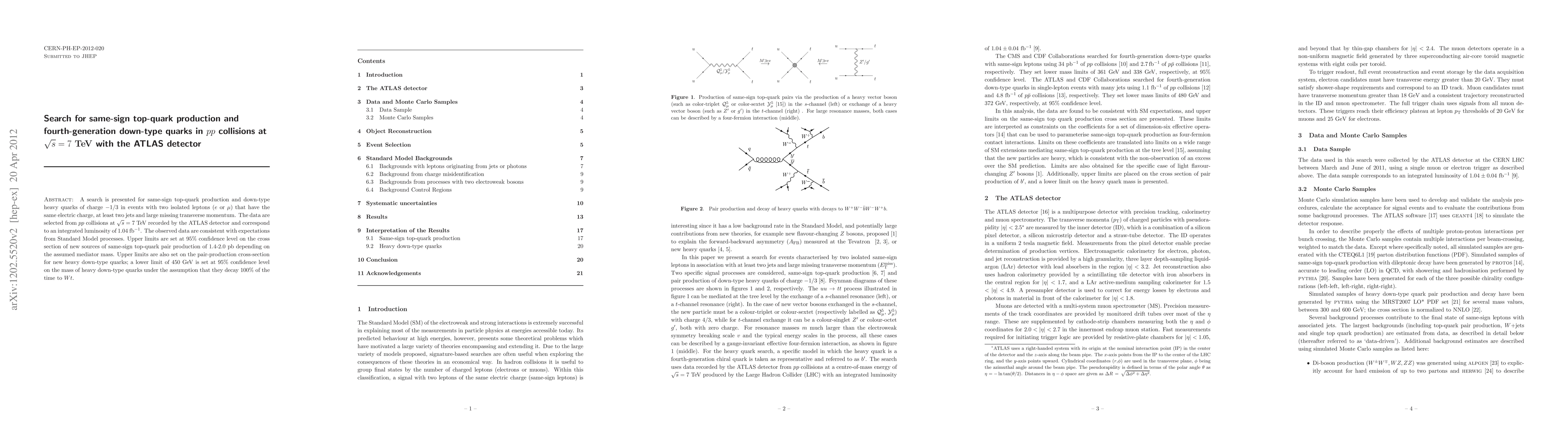 This paper investigates the production of same-sign top-quark pairs and fourth-generation down-type quarks in proton-proton collisions at 7 TeV using the ATLAS detector. No significant deviations from Standard Model predictions were observed, leading to upper limits on their production cross-sections and a lower mass limit of 450 GeV for the down-type quarks.