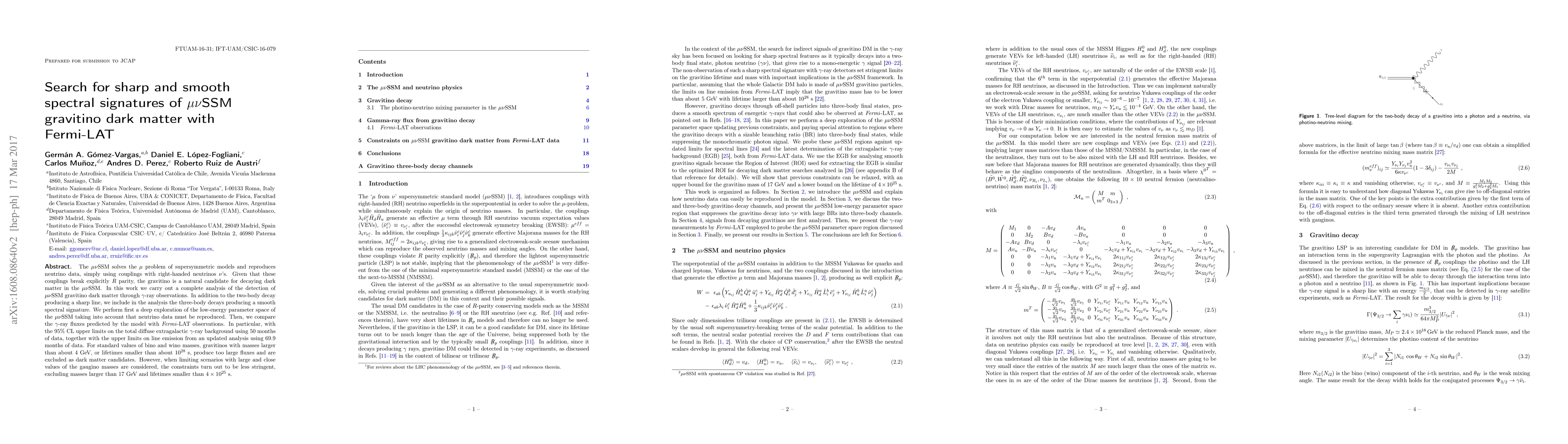 This paper investigates the $\mu\nu$SSM gravitino as a dark matter candidate, analyzing both sharp two-body decay lines and smooth three-body decay signatures in $\gamma$-ray observations using Fermi-LAT data. The study excludes gravitinos with masses above 4 GeV or lifetimes below $10^{28}$ s, but less stringent constraints apply for scenarios with large gaugino masses, excluding masses above 17 GeV and lifetimes below $4\times 10^{25}$ s.
