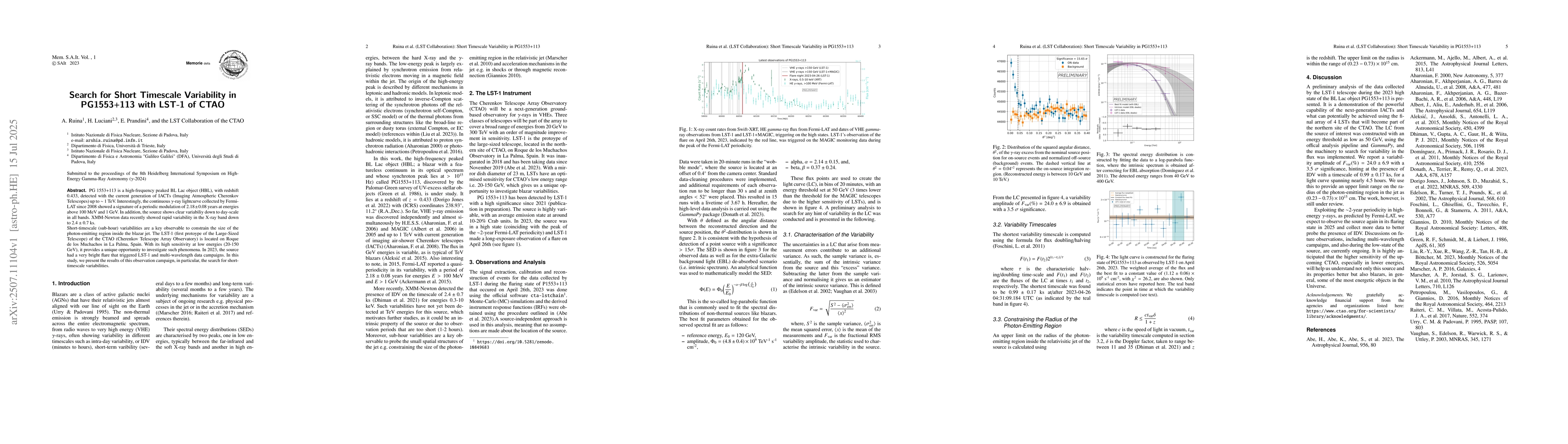PG 1553+113 is a high-frequency peaked BL Lac object (HBL), with redshift 0.433, detected with the current generation of IACTs (Imaging Atmospheric Cherenkov Telescopes) up to $\sim$ 1 TeV. Interestingly, the continuous $\gamma$-ray lightcurve collected by Fermi-LAT since 2008 showed a signature of a periodic modulation of $2.18 \pm 0.08$ years at energies above 100 MeV and 1 GeV. In addition, the source shows clear variabiliy down to day-scale in all bands. XMM-Newton data recently showed rapid variability in the X-ray band down to $2.4 \pm 0.7$ ks. Short-timescale (sub-hour) variabilities are a key observable to constrain the size of the photon-emitting region inside the blazar jet. The LST-1 (first protoype of the Large-Sized Telescope) of the CTAO (Cherenkov Telescope Array Observatory) is located on Roque de los Muchachos in La Palma, Spain. With its high sensitivity at low energies (20-150 GeV), it provides a unique opportunity to investigate such phenomena. In 2023, the source had a very bright flare that triggered LST-1 and multi-wavelength data campaigns. In this study, we present the results of this observation campaign, in particular, the search for short-timescale variabilities.