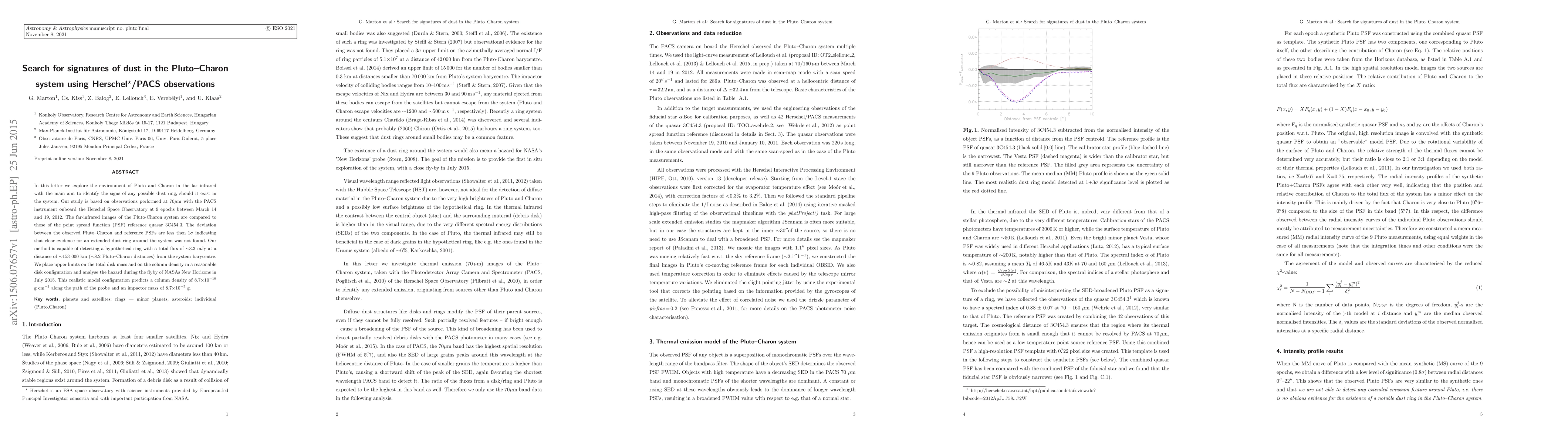 This study uses Herschel/PACS observations to search for dust signatures in the Pluto-Charon system, finding no clear evidence of an extended dust ring at 70 µm. The method can detect a ring with a flux of ~3.3 mJy at ~153,000 km from the system barycentre, placing upper limits on the total disk mass and column density.