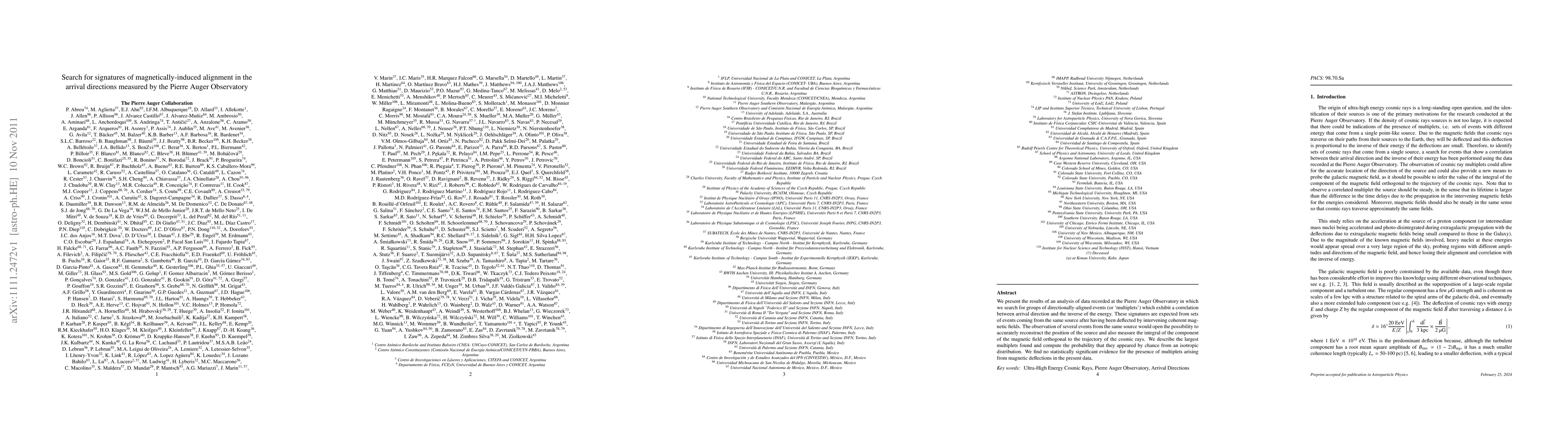 The Pierre Auger Observatory analyzed data for directionally-aligned cosmic ray events, searching for "multiplets" indicating magnetic alignment. No statistically significant evidence was found to support the presence of multiplets from magnetic deflections.
