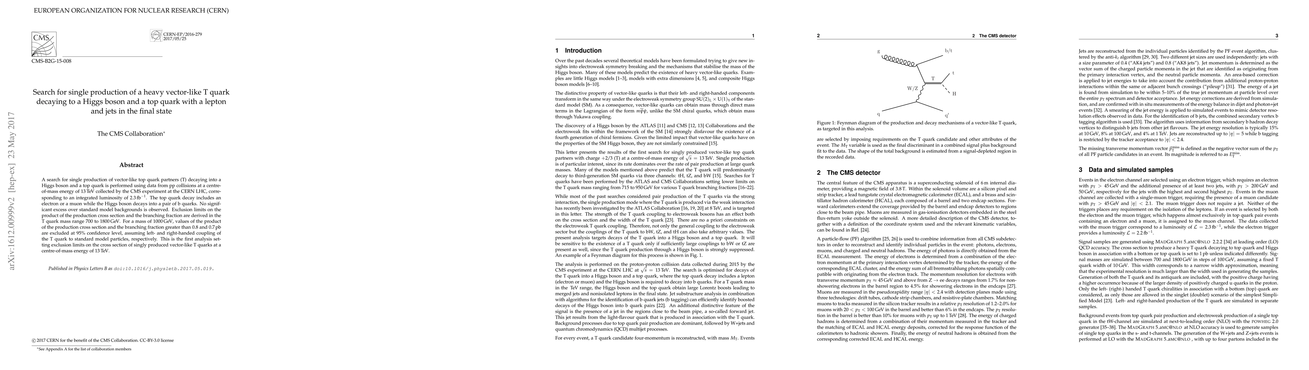 This paper reports a search for a heavy vector-like T quark decaying into a Higgs boson and a top quark using CMS data at the LHC. No significant excess is observed, leading to exclusion limits on the production cross section for T quark masses between 700 and 1800 GeV.