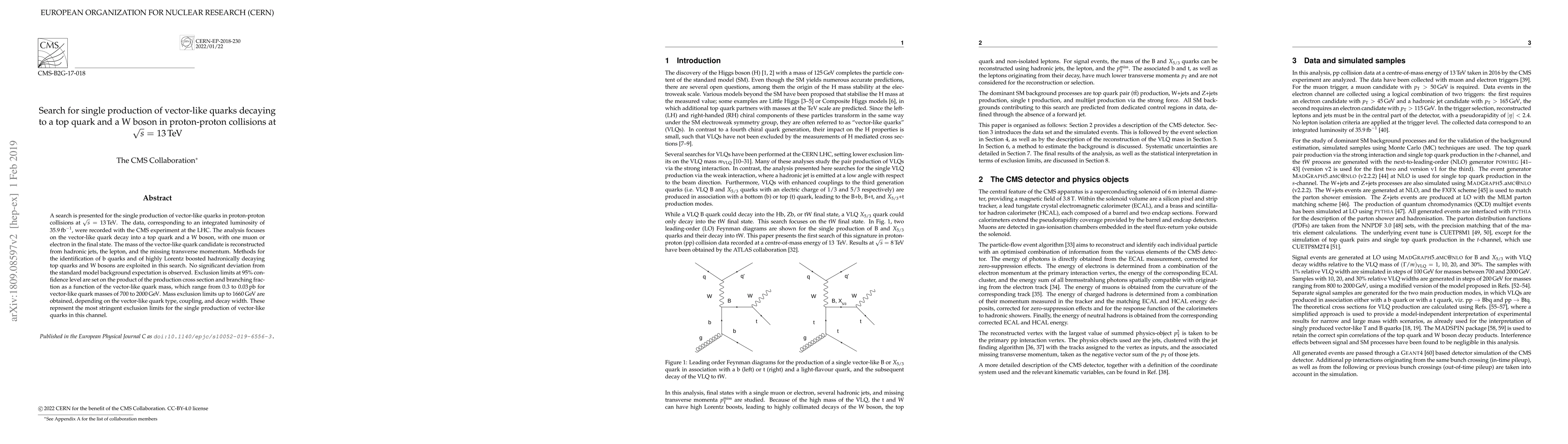 Researchers searched for vector-like quarks produced in proton-proton collisions, finding no significant deviation from standard model expectations, setting exclusion limits on their masses.