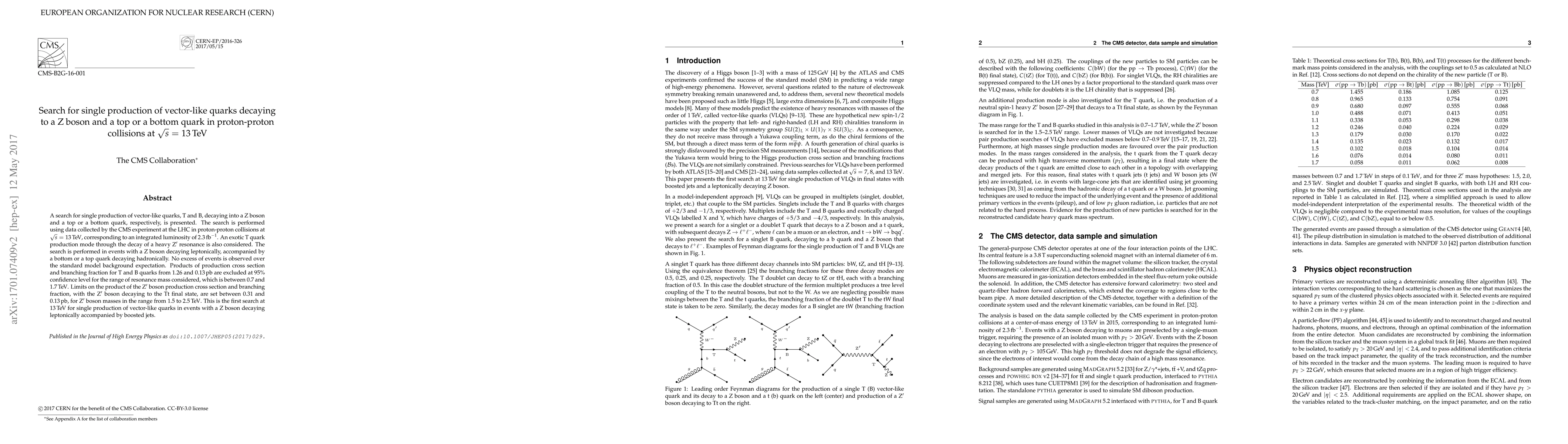 This paper reports a search for single production of vector-like quarks T and B decaying into a Z boson and a top or bottom quark, respectively, using CMS data from proton-proton collisions at 13 TeV. No excess events were observed, leading to exclusion limits on the production cross sections and branching fractions for these quarks and a Z' boson.
