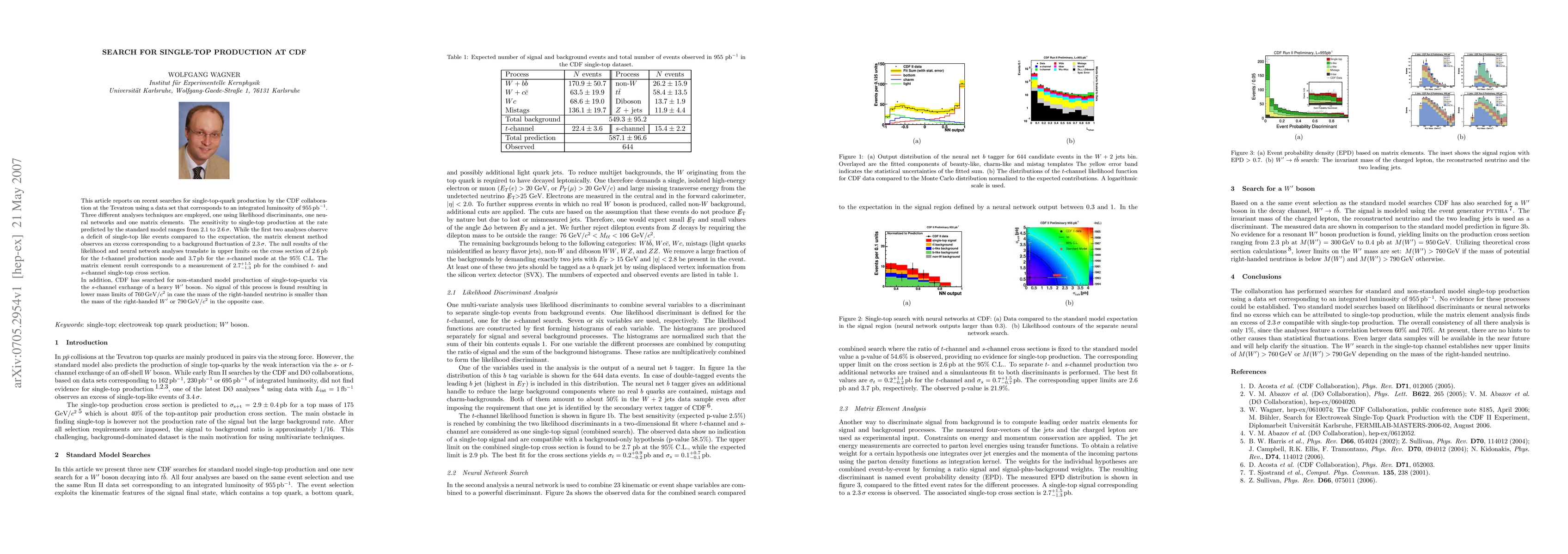 This article reports on recent searches for single-top-quark production by the CDF collaboration at the Tevatron using a data set that corresponds to an integrated luminosity of 955 pb^-1. Three different analyses techniques are employed, one using likelihood discriminants, one neural networks and one matrix elements. The sensitivity to single-top production at the rate predicted by the standard model ranges from 2.1 to 2.6 sigma. While the first two analyses observe a deficit of single-top like events compared to the expectation, the matrix element method observes an excess corresponding to a background fluctuation of 2.3 sigma. The null results of the likelihood and neural network analyses translate in upper limits on the cross section of 2.6\ pb for the t-channel production mode and 3.7 pb for the s-channel mode at the 95% C.L. The matrix element result corresponds to a measurement of 2.7^+1.5_-1.3 pb for the combined t- and s-channel single-top cross section. In addition, CDF has searched for non-standard model production of single-top-quarks via the s-channel exchange of a heavy W^\prime boson. No signal of this process is found resulting in lower mass limits of 760 GeV/c^2 in case the mass of the right-handed neutrino is smaller than the mass of the right-handed W^\prime or 790 GeV/c^2 in the opposite case.