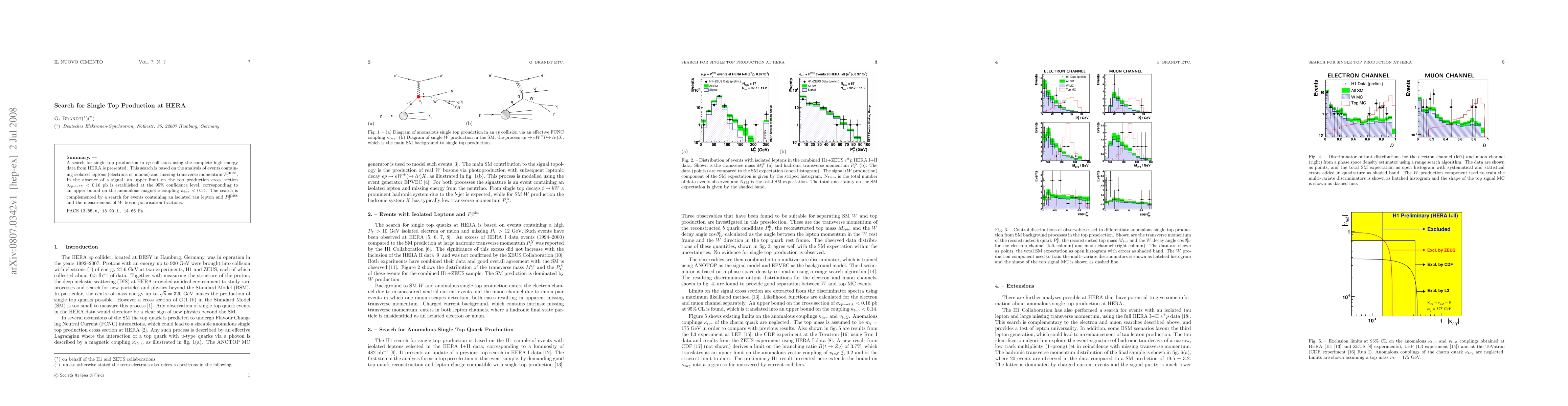 A search for single top production in ep collisions using the complete high energy data from HERA is presented. This search is based on the analysis of events containing isolated leptons (electrons or muons) and missing transverse momentum PTmiss. In the absence of a signal, an upper limit on the top production cross section sigma_ep -> etX < 0.16 pb is established at the 95% confidence level, corresponding to an upper bound on the anomalous magnetic coupling kappa_tug < 0.14. The search is complemented by a search for events containing an isolated tau lepton and PTmiss and the measurement of W boson polarisation fractions.