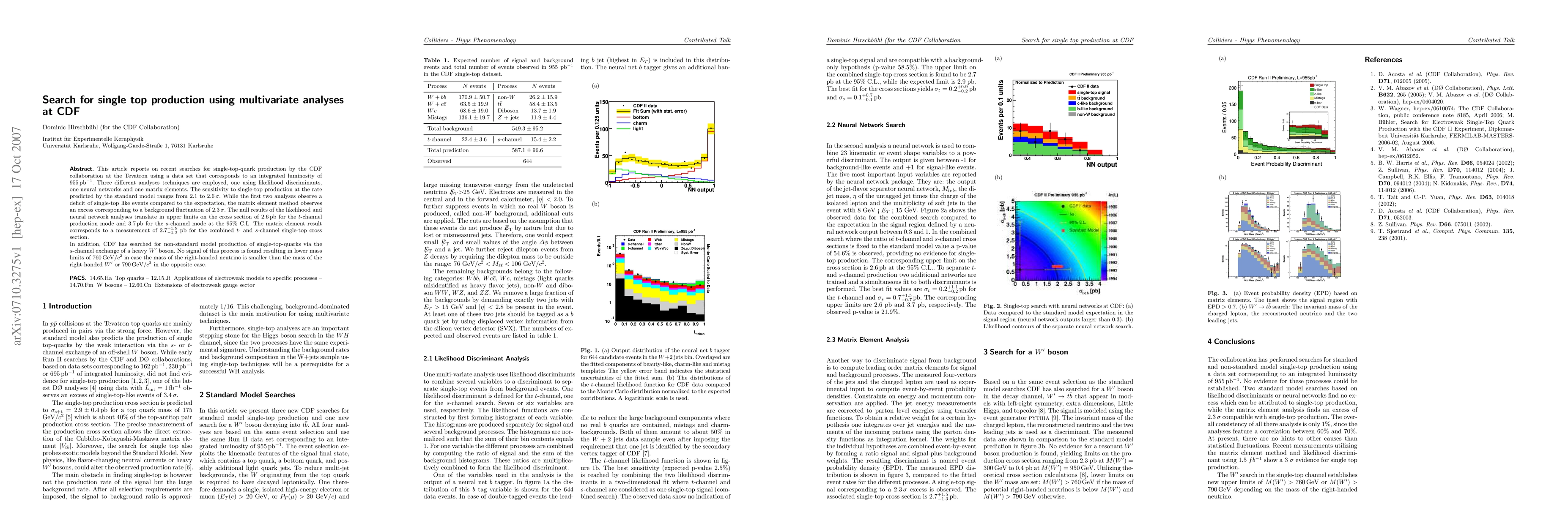 This article reports on recent searches for single-top-quark production by the CDF collaboration at the Tevatron using a data set that corresponds to an integrated luminosity of 955 fb^-1. Three different analyses techniques are employed, one using likelihood discriminants, one neural networks and one matrix elements. The sensitivity to single-top production at the rate predicted by the standard model ranges from 2.1 to 2.6 sigma. While the first two analyses observe a deficit of single-top like events compared to the expectation, the matrix element method observes an excess corresponding to a background fluctuation of 2.3 sigma. The null results of the likelihood and neural network analyses translate in upper limits on the cross section of 2.6 pb for the t-channel production mode and 3.7 pb for the s-channel mode at the 95% C.L. The matrix element result corresponds to a measurement of 2.7^{+1.5}_{-1.3} pb for the combined t- and s-channel single-top cross section. In addition, CDF has searched for non-standard model production of single-top-quarks via the s-channel exchange of a heavy W' boson. No signal of this process is found resulting in lower mass limits of 760 GeV/c^2 in case the mass of the right-handed neutrino is smaller than the mass of the right-handed W' or 790 GeV/c^2 in the opposite case.