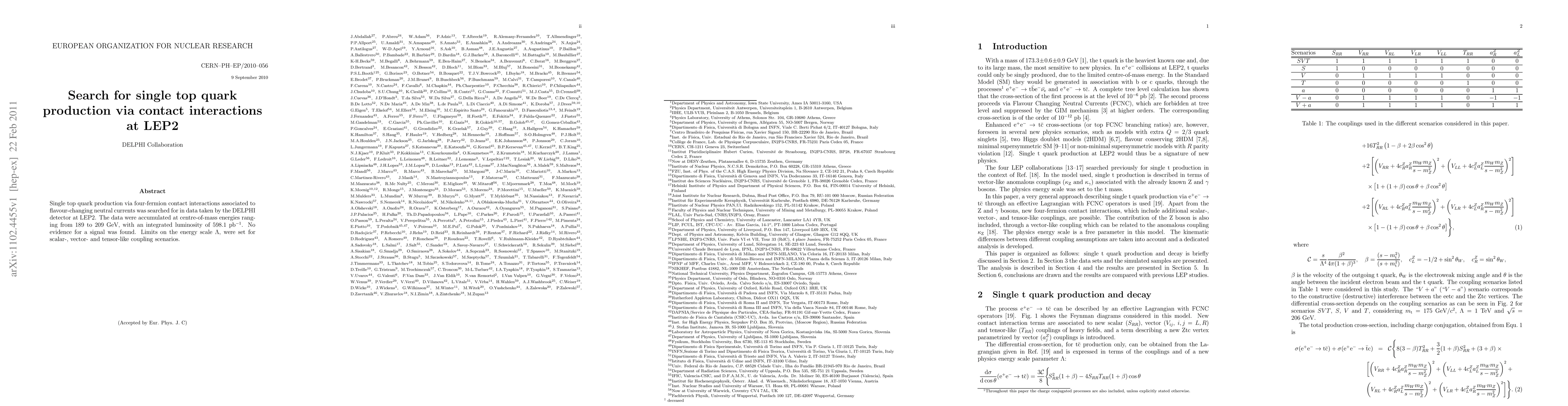 Single top quark production via four-fermion contact interactions associated to flavour-changing neutral currents was searched for in data taken by the DELPHI detector at LEP2. The data were accumulated at centre-of-mass energies ranging from 189 to 209 GeV, with an integrated luminosity of 598.1 pb^-1. No evidence for a signal was found. Limits on the energy scale Lambda, were set for scalar-, vector- and tensor-like coupling scenarios.