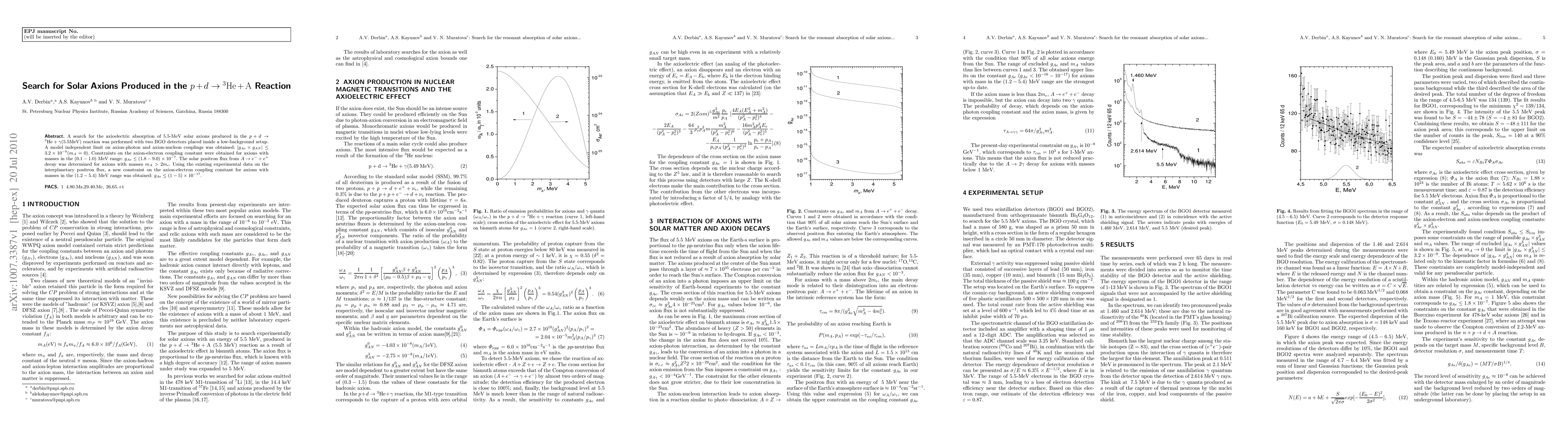 This paper reports a search for solar axions produced in the proton-deuteron fusion reaction using BGO detectors, setting model-independent limits on axion-photon and axion-nucleon couplings. It also provides constraints on the axion-electron coupling for axion masses in specified ranges and determines the solar positron flux from axion decay.