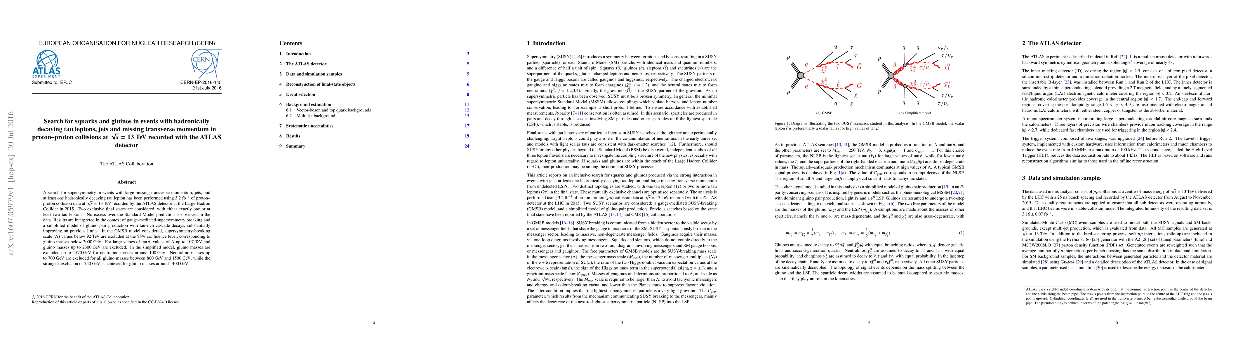 This research by ATLAS detector at LHC excludes supersymmetry in events with missing transverse momentum, jets, and hadronically decaying tau leptons, setting new limits on gluino and squark masses in Gauge-Mediated Supersymmetry Breaking and simplified models.