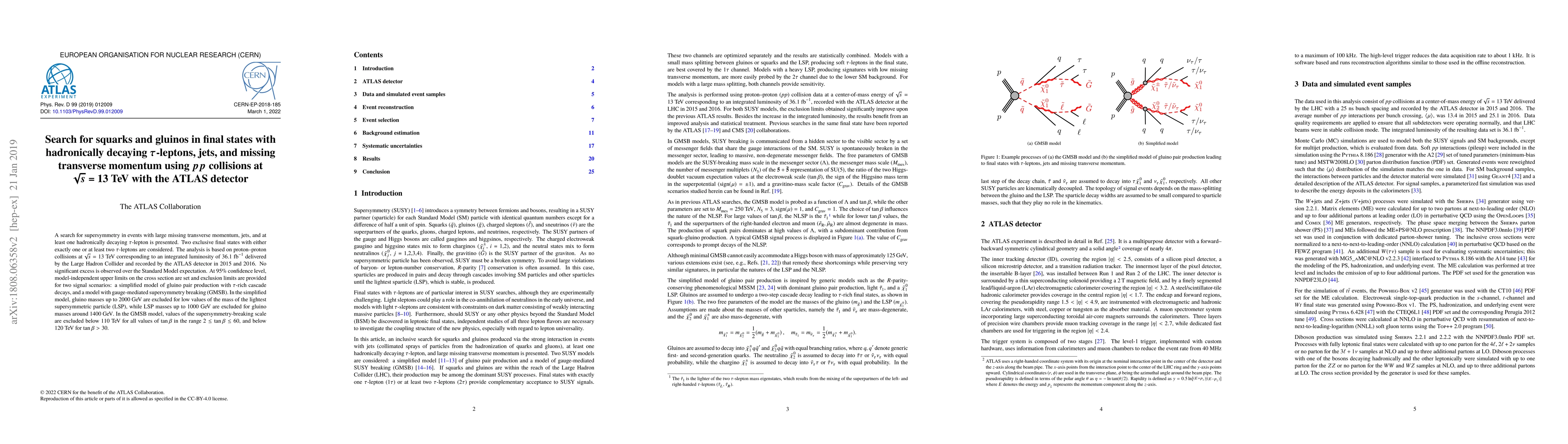 This ATLAS detector study at the Large Hadron Collider, analyzing 13 TeV proton-proton collisions, didn't find evidence for supersymmetry in events with missing transverse momentum, jets, and hadronically decaying tau-leptons. Excluding supersymmetric particles like gluinos and squarks, it sets upper limits on their cross-sections and rules out certain mass ranges: gluinos up to 2000 GeV for low LSP masses, and LSP masses up to 1000 GeV for gluinos around 1400 GeV. For GMSB models, supersymmetry-breaking scales below 110 TeV are excluded for most $ aneta$ values.