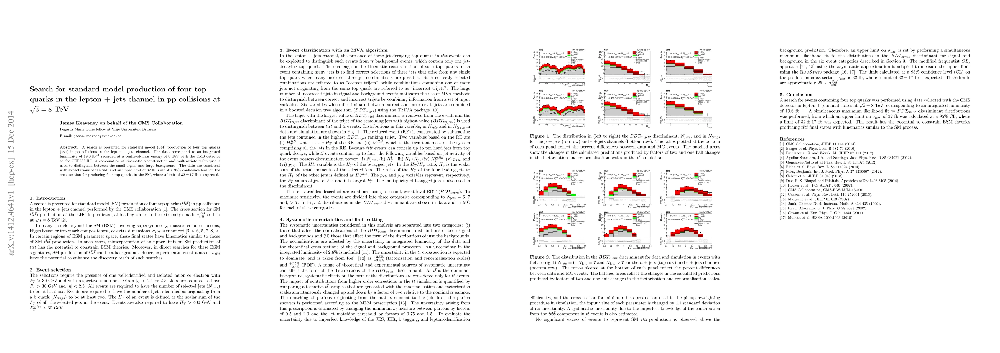 A search is presented for standard model (SM) production of four top quarks ($t\bar{t}t\bar{t}$) in pp collisions in the lepton + jets channel. The data correspond to an integrated luminosity of 19.6 fb$^{-1}$ recorded at a centre-of-mass energy of 8 TeV with the CMS detector at the CERN LHC. A combination of kinematic reconstruction and multivariate techniques is used to distinguish between the small signal and large background. The data are consistent with expectations of the SM, and an upper limit of 32 fb is set at a 95\% confidence level on the cross section for producing four top quarks in the SM, where a limit of $32\pm{17}$ fb is expected.