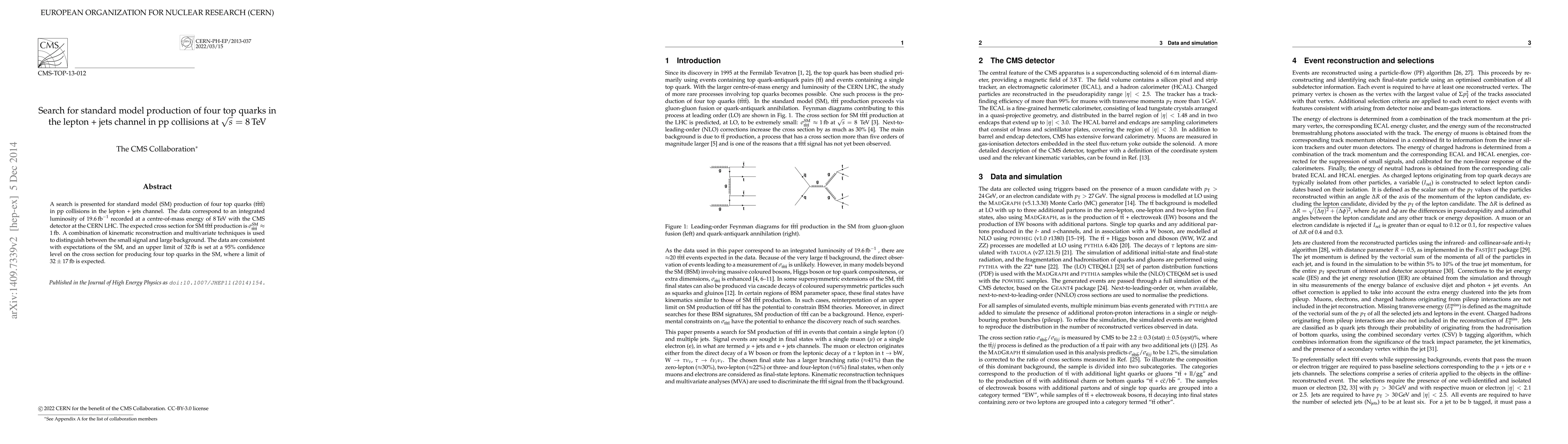 A search is presented for standard model (SM) production of four top quarks (t t-bar t t-bar) in pp collisions in the lepton + jets channel. The data correspond to an integrated luminosity of 19.6 inverse femtobarns recorded at a centre-of-mass energy of 8 TeV with the CMS detector at the CERN LHC. The expected cross section for SM four top quark production is approximately 1 fb. A combination of kinematic reconstruction and multivariate techniques is used to distinguish between the small signal and large background. The data are consistent with expectations of the SM, and an upper limit of 32 fb is set at a 95% confidence level on the cross section for producing four top quarks in the SM, where a limit of 32 +/- 17 fb is expected.