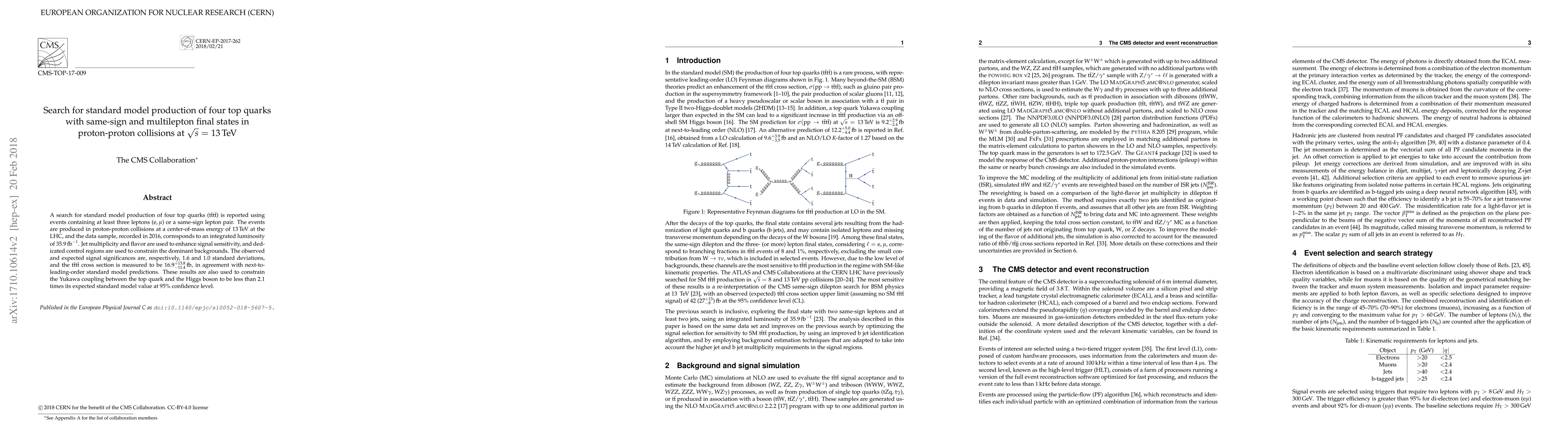 A search for standard model production of four top quarks ($\mathrm{t}\overline{\mathrm{t}}\mathrm{t}\overline{\mathrm{t}})$ is reported using events containing at least three leptons (e, $\mu$) or a same-sign lepton pair. The events are produced in proton-proton collisions at a center-of-mass energy of 13 TeV at the LHC, and the data sample, recorded in 2016, corresponds to an integrated luminosity of 35.9 fb$^{-1}$. Jet multiplicity and flavor are used to enhance signal sensitivity, and dedicated control regions are used to constrain the dominant backgrounds. The observed and expected signal significances are, respectively, 1.6 and 1.0 standard deviations, and the $\mathrm{t}\overline{\mathrm{t}}\mathrm{t}\overline{\mathrm{t}}$ cross section is measured to be 16.9 $^{+13.8}_{-11.4}$ fb, in agreement with next-to-leading-order standard model predictions. These results are also used to constrain the Yukawa coupling between the top quark and the Higgs boson to be less than 2.1 times its expected standard model value at 95% confidence level.