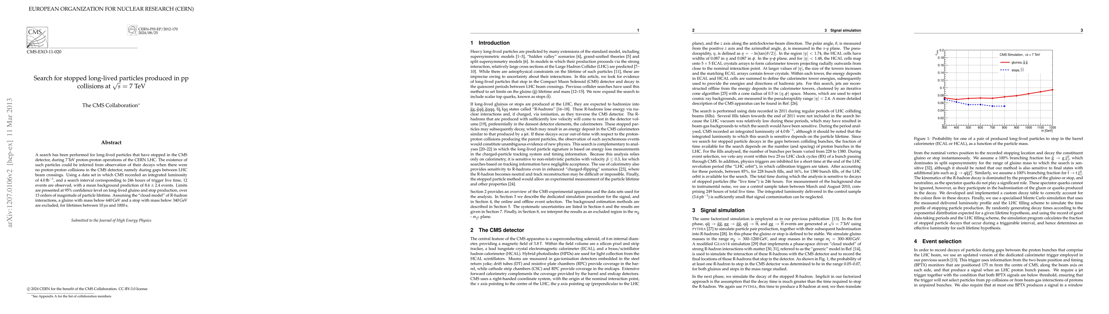 This paper reports a search for long-lived particles produced in proton-proton collisions at 7 TeV in the CMS detector at the LHC, focusing on particles that stop and decay between beam crossings. No significant excess over background was observed, leading to exclusion limits on gluino and stop masses for various lifetimes.