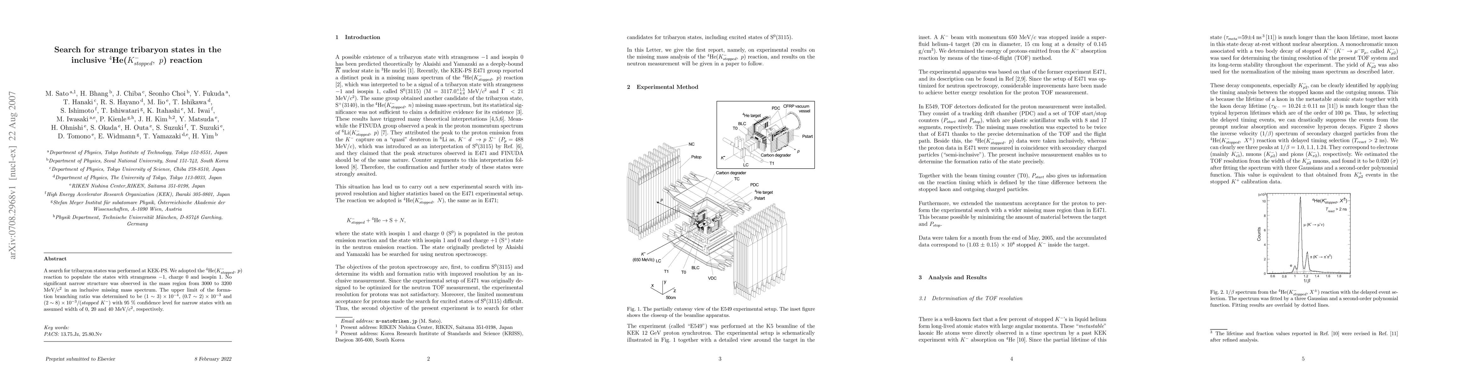 A search for tribaryon states was performed at KEK-PS. We adopted the $^4$He($K^-_{stopped}, p)$ reaction to populate the states with strangeness -1, charge 0 and isospin 1. No significant narrow structure was observed in the mass region from 3000 to 3200 MeV/c^2 in an inclusive missing mass spectrum. The upper limit of the formation branching ratio was determined to be ($1\sim3)\times 10^{-4}$, ($0.7\sim2)\times 10^{-3}$ and ($2\sim8) \times 10^{-3}$/($stopped K^{-}$) with 95 % confidence level for narrow states with an assumed width of 0, 20 and 40 MeV/c^2, respectively.