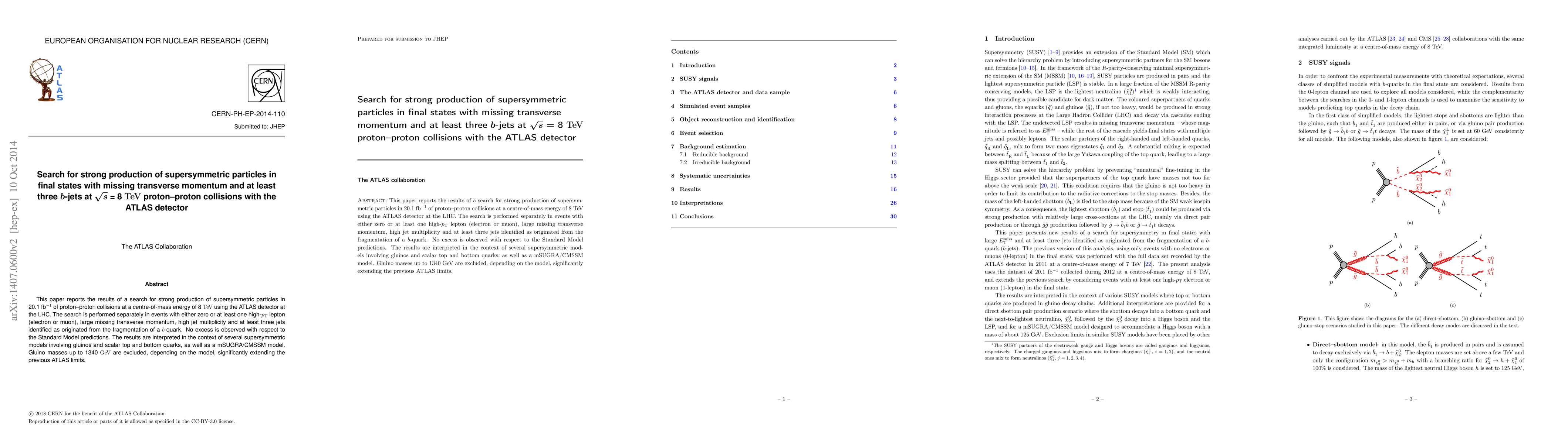 This paper presents a search for strong production of supersymmetric particles in proton-proton collisions at 8 TeV using the ATLAS detector, finding no excess over Standard Model predictions. The results exclude gluino masses up to 1340 GeV, extending previous ATLAS limits.