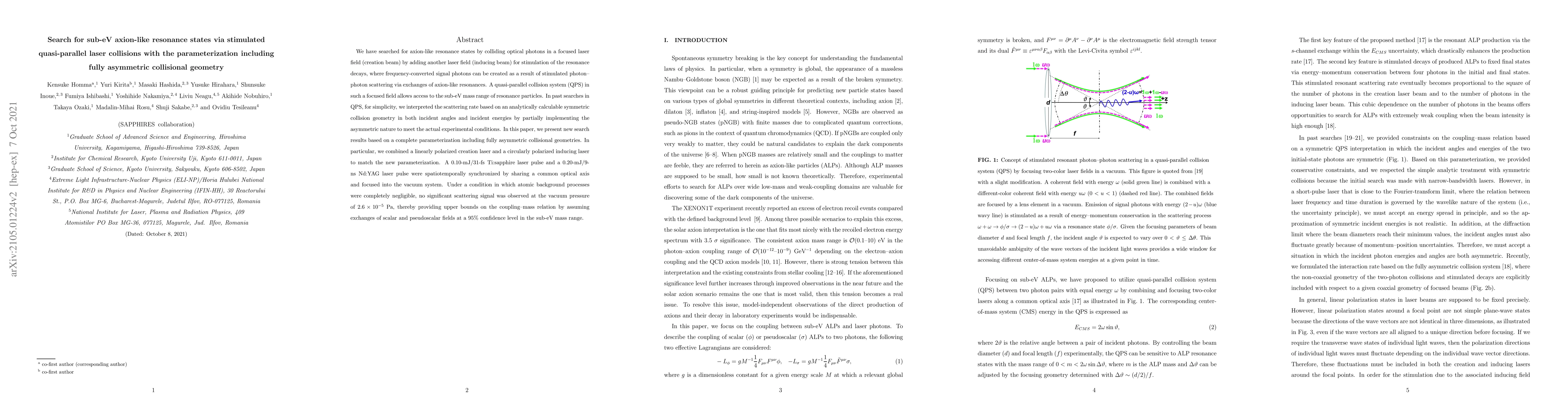 We have searched for axion-like resonance states by colliding optical photons in a focused laser field (creation beam) by adding another laser field (inducing beam) for stimulation of the resonance decays, where frequency-converted signal photons can be created as a result of stimulated photon-photon scattering via exchanges of axion-like resonances. A quasi-parallel collision system (QPS) in such a focused field allows access to the sub-eV mass range of resonance particles. In past searches in QPS, for simplicity, we interpreted the scattering rate based on an analytically calculable symmetric collision geometry in both incident angles and incident energies by partially implementing the asymmetric nature to meet the actual experimental conditions. In this paper, we present new search results based on a complete parameterization including fully asymmetric collisional geometries. In particular, we combined a linearly polarized creation laser and a circularly polarized inducing laser to match the new parameterization. A 0.10 mJ / 31 fs Ti:sapphire laser pulse and a 0.20 mJ / 9 ns Nd:YAG laser pulse were spatiotemporally synchronized by sharing a common optical axis and focused into the vacuum system. Under a condition in which atomic background processes were completely negligible, no significant scattering signal was observed at the vacuum pressure of $2.6 \times 10^{-5}$ Pa, thereby providing upper bounds on the coupling-mass relation by assuming exchanges of scalar and pseudoscalar fields at a 95 % confidence level in the sub-eV mass range.