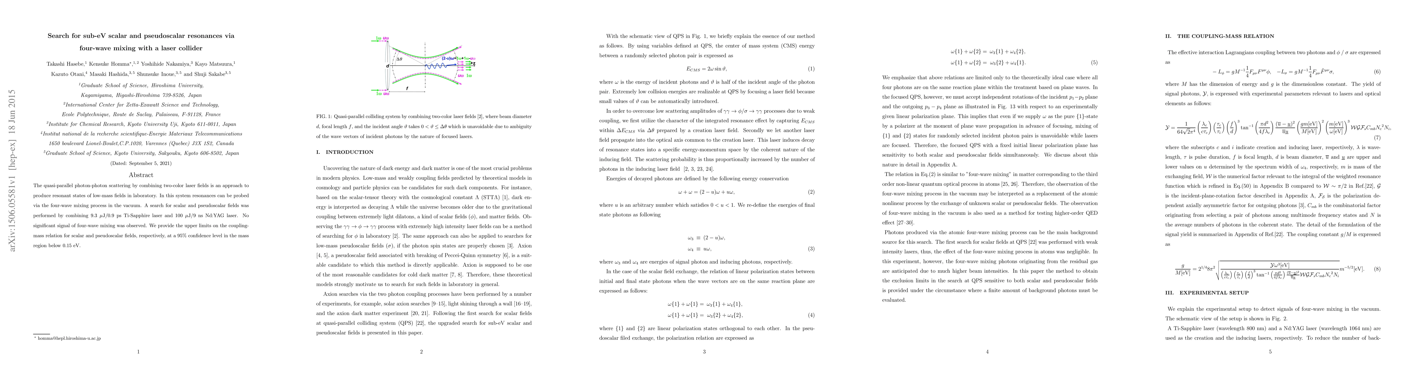 Researchers searched for sub-eV scalar and pseudoscalar resonances using a laser collider, setting upper limits on their coupling-mass relation below 0.15 eV.